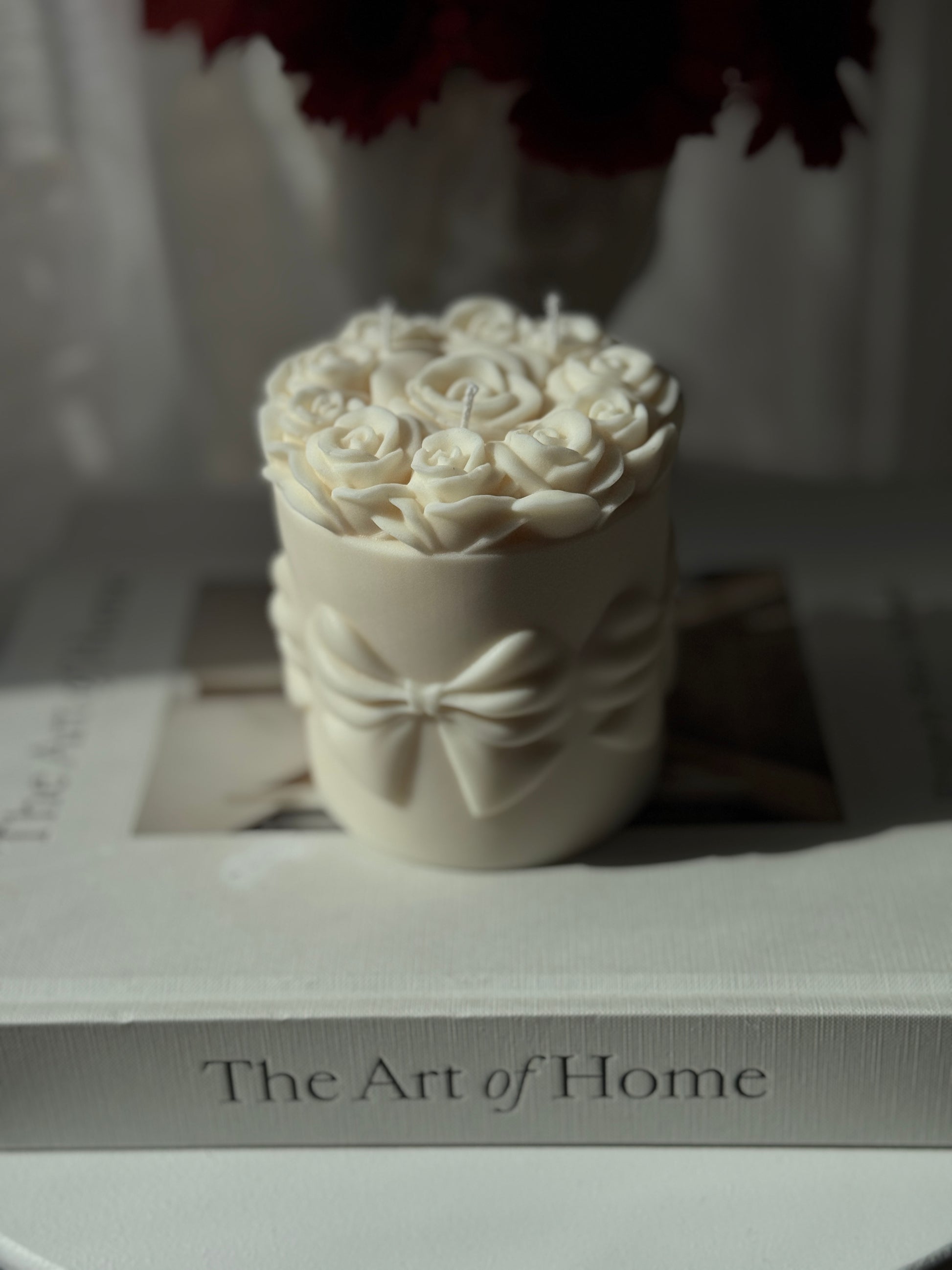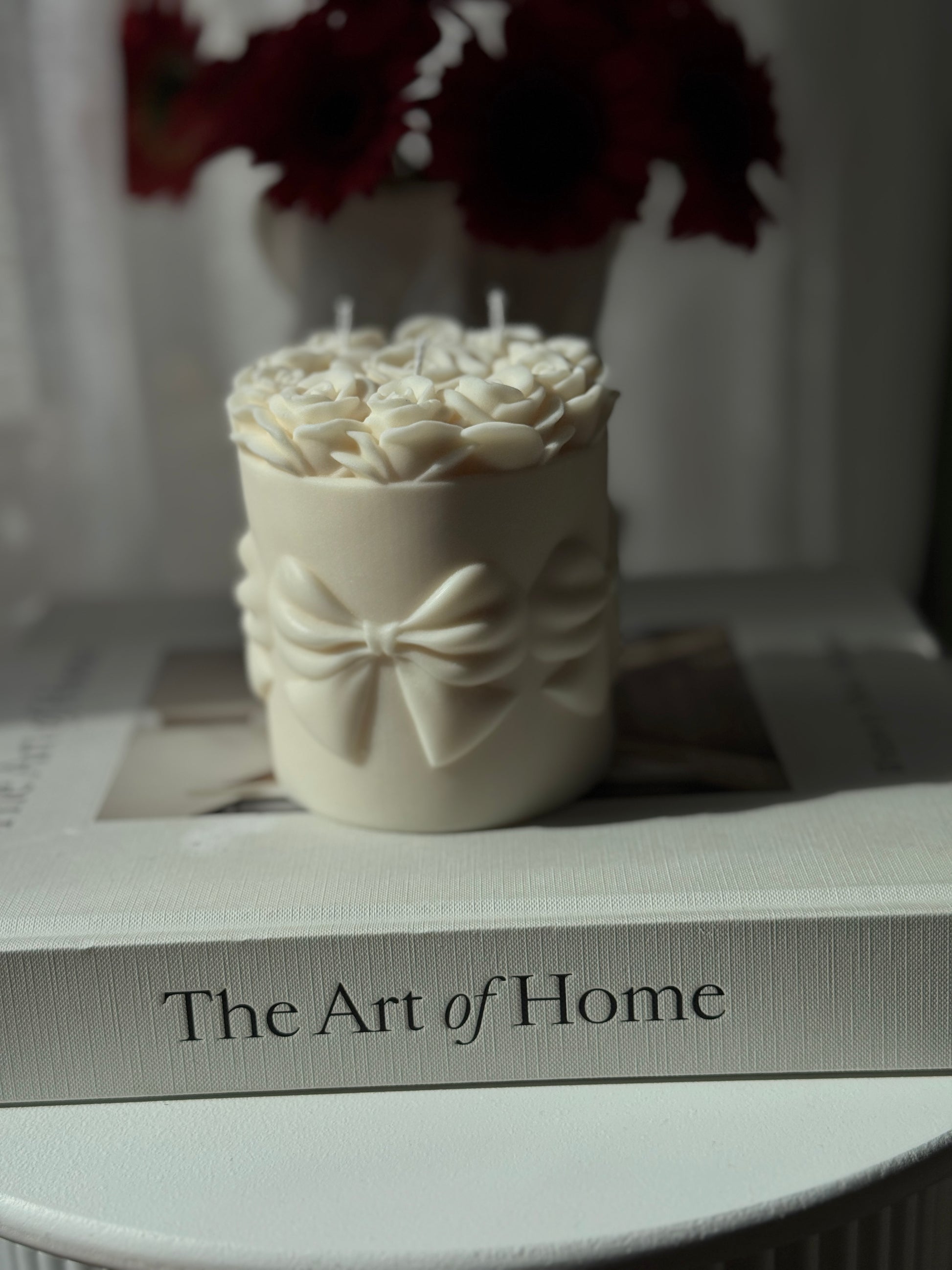 An exquisite floral pillar candle featuring sculptural bows around the base and a crown of roses on top. A true statement piece for romantic interiors.