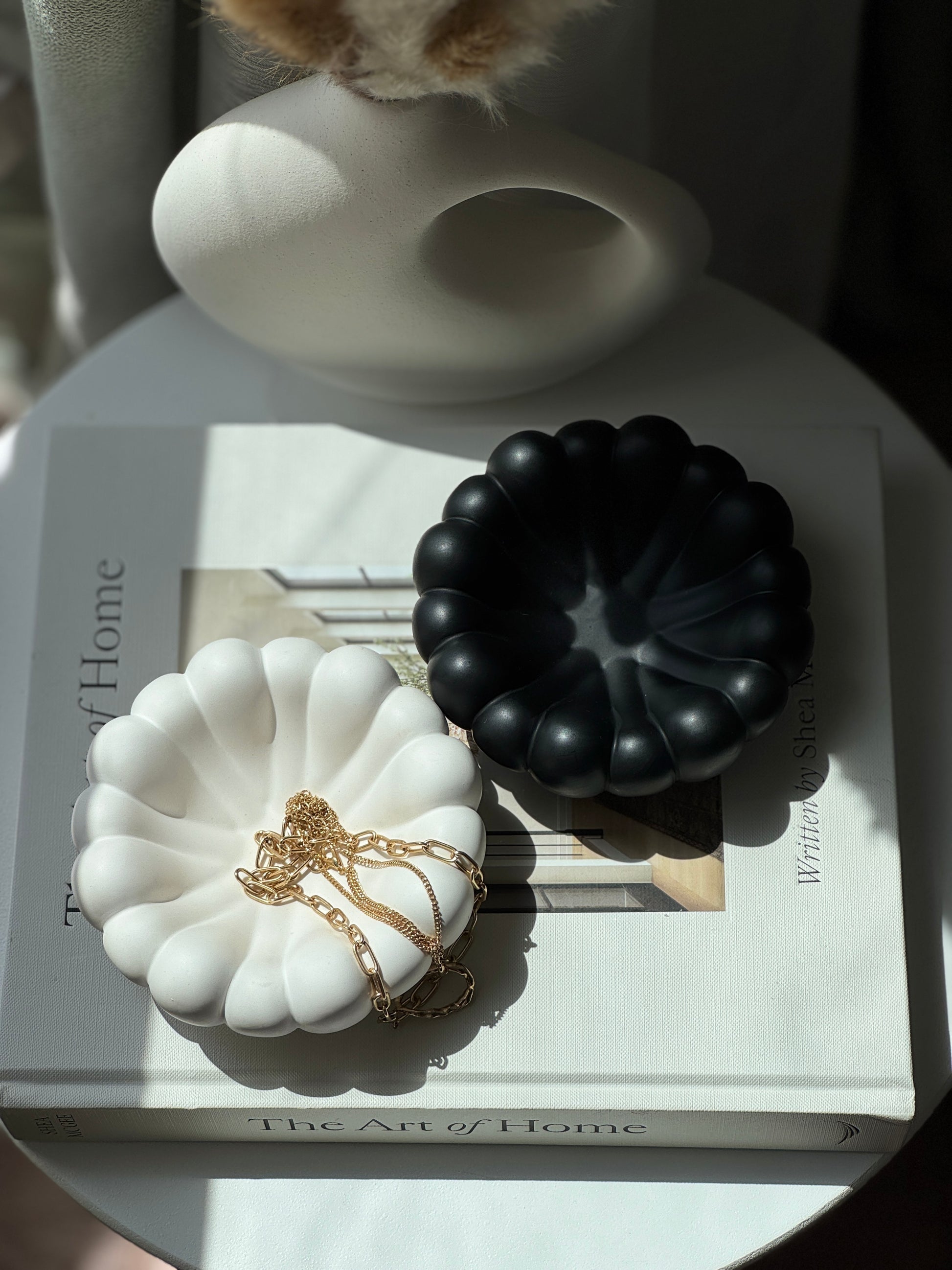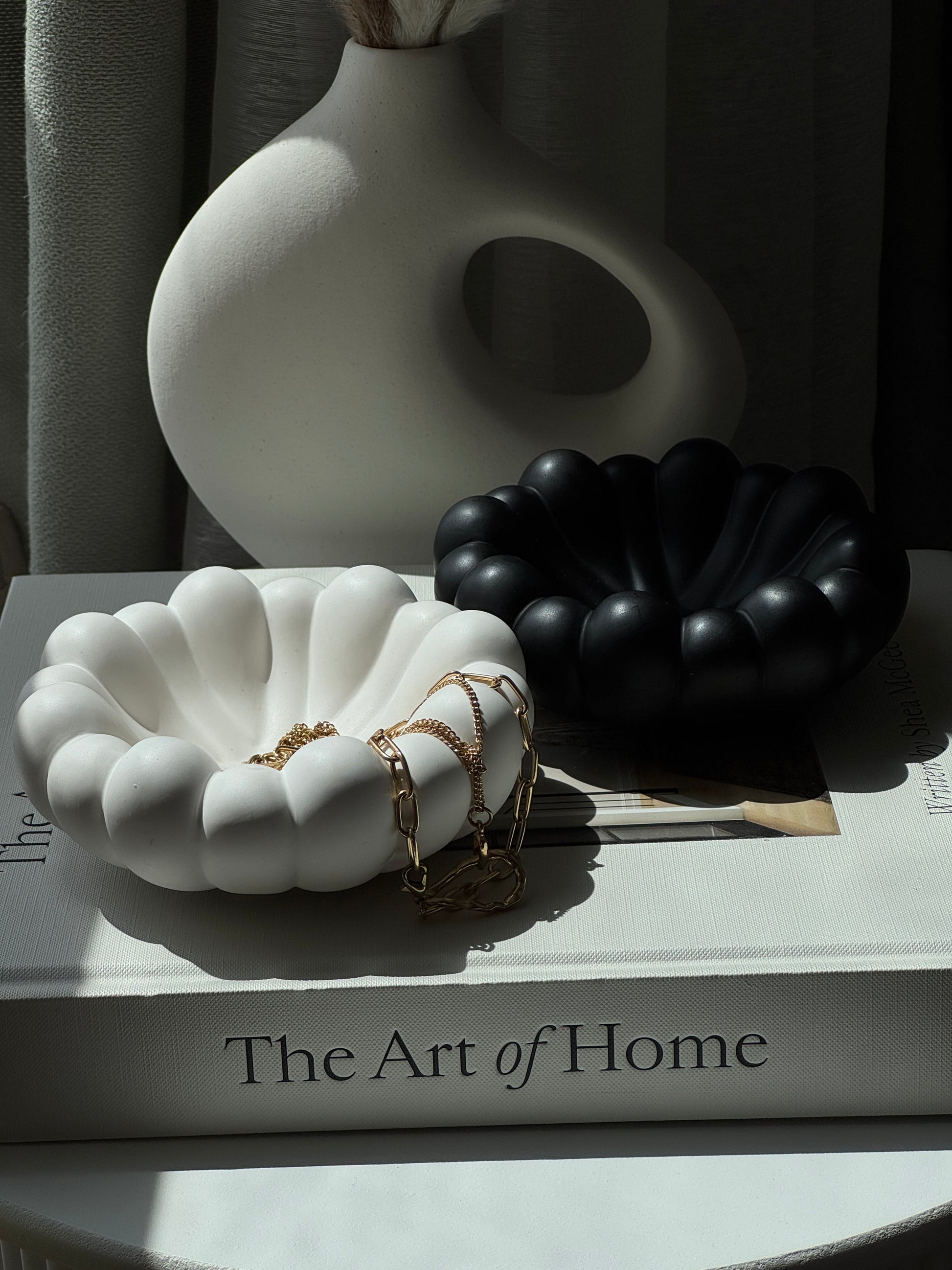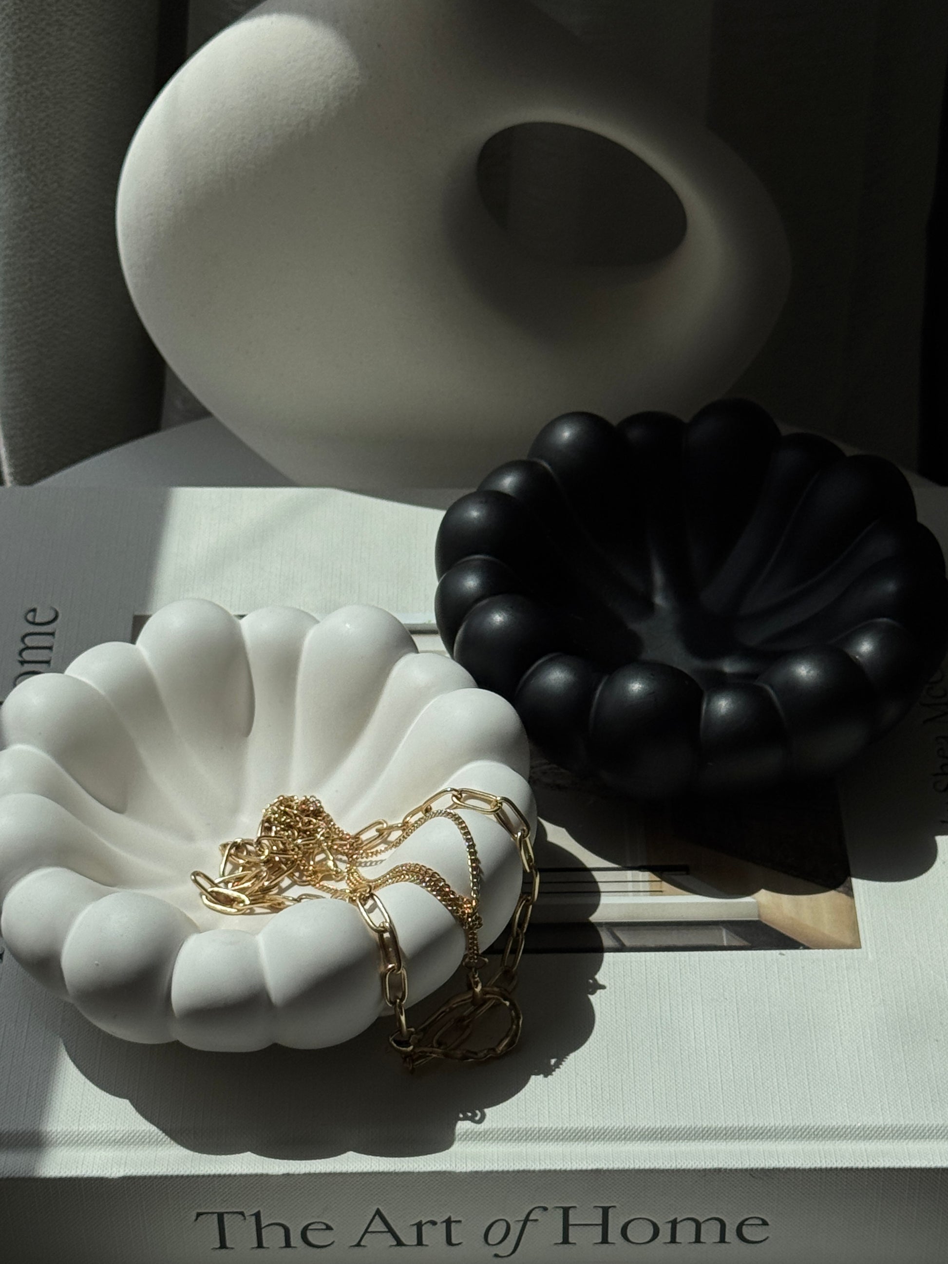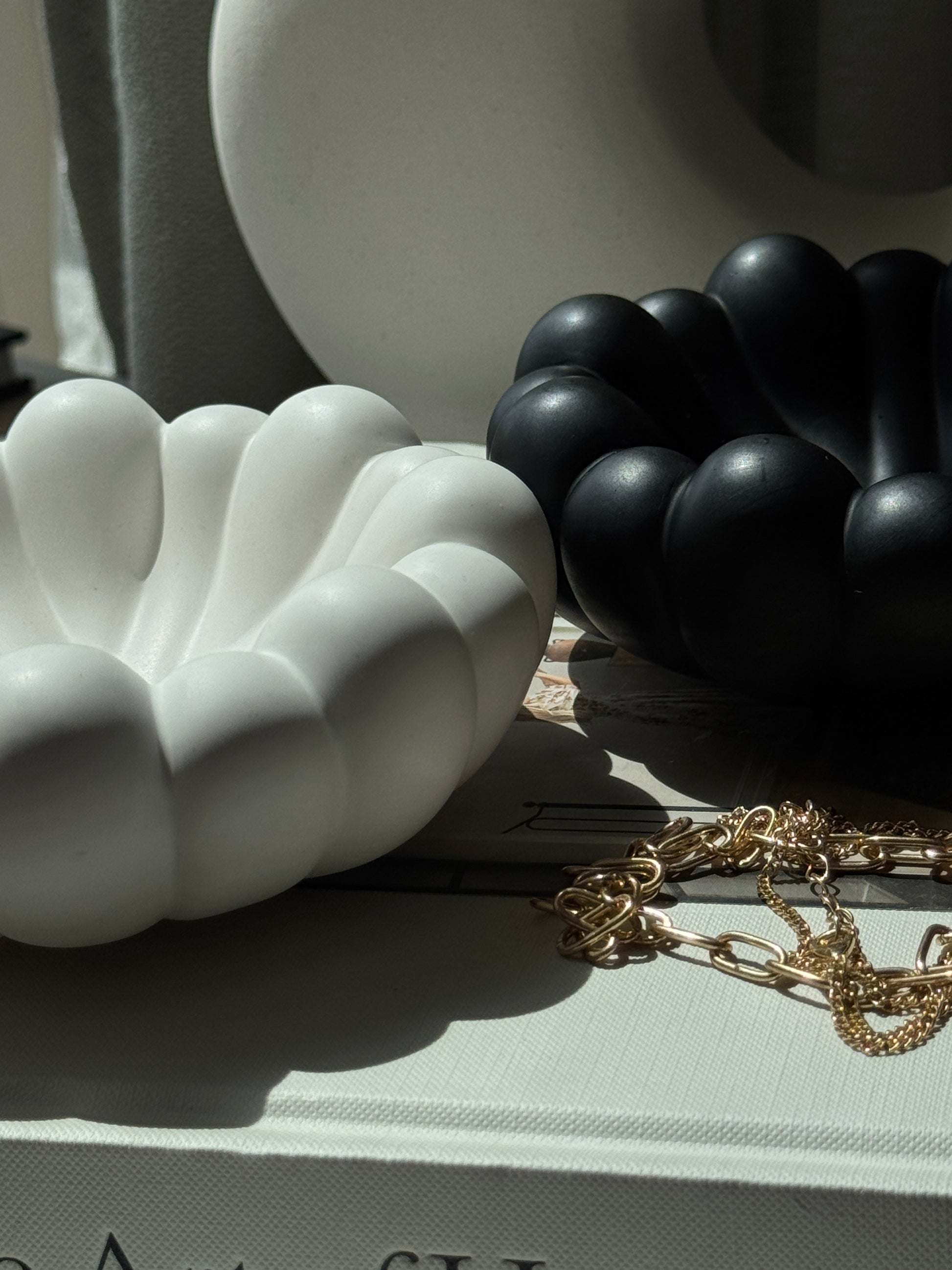 A sculptural interpretation of playful softness, the Bubble Trays combine functionality with statement design. Handmade in black Jesmonite and white Porcelain, they bring a modern, minimal yet artistic touch to any space. Perfect for styling jewelry, candles, or small treasures.