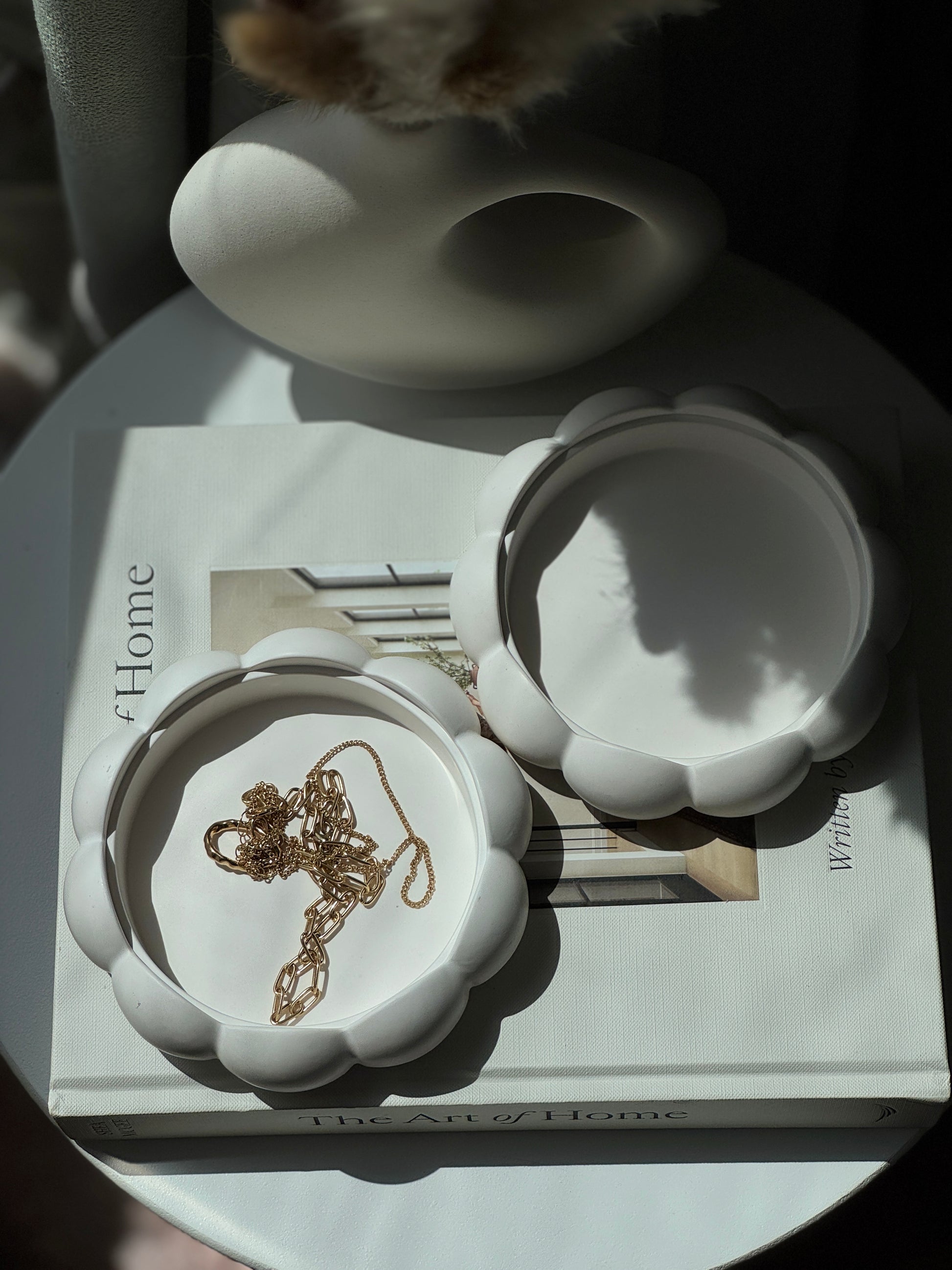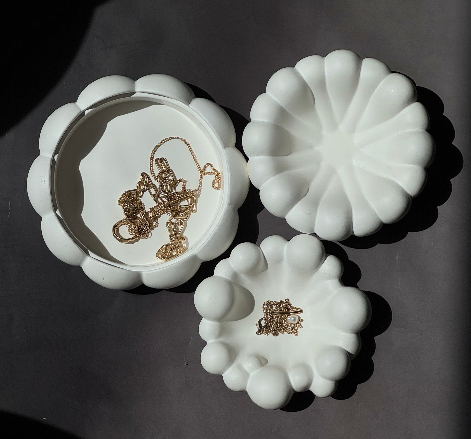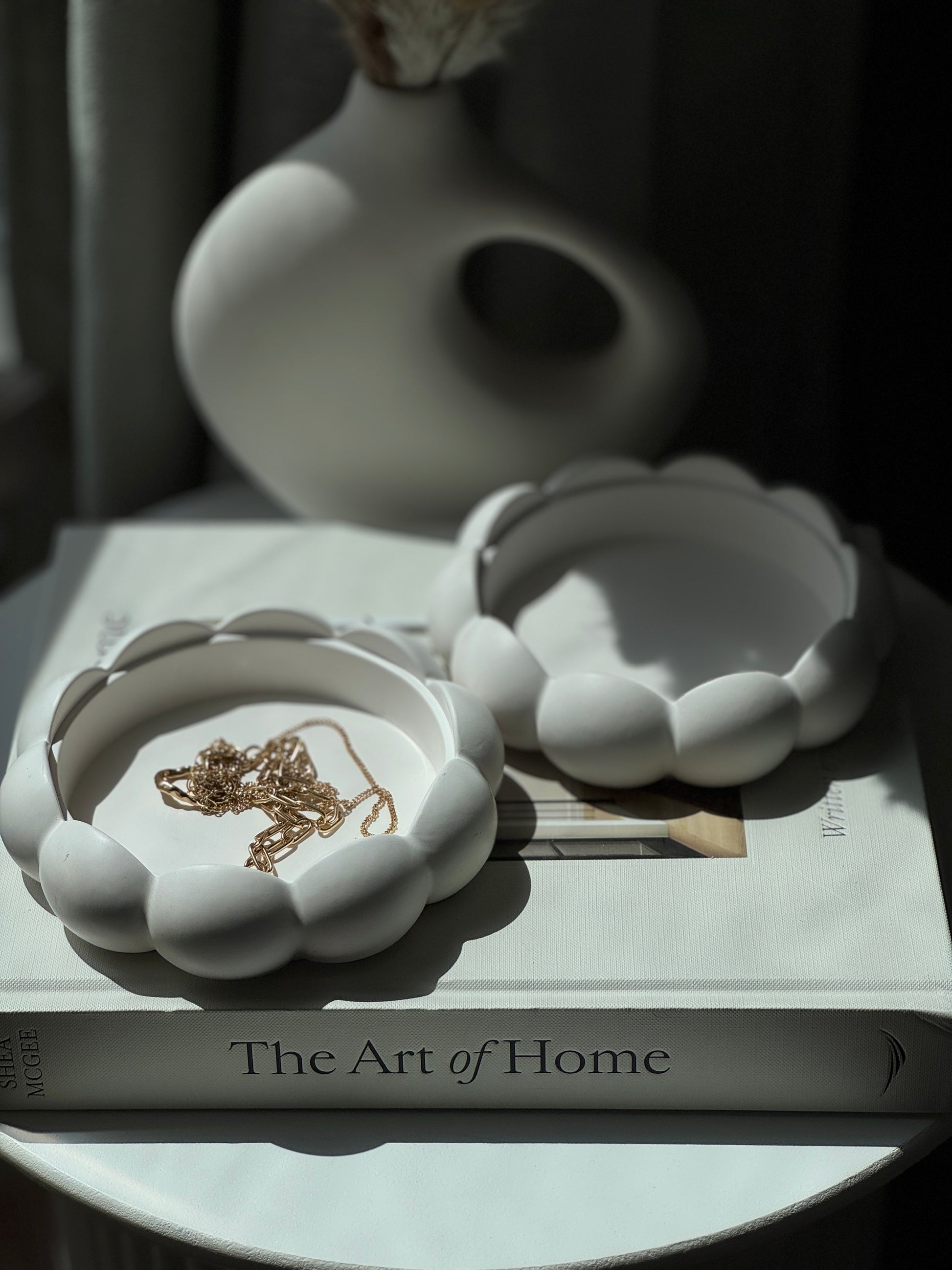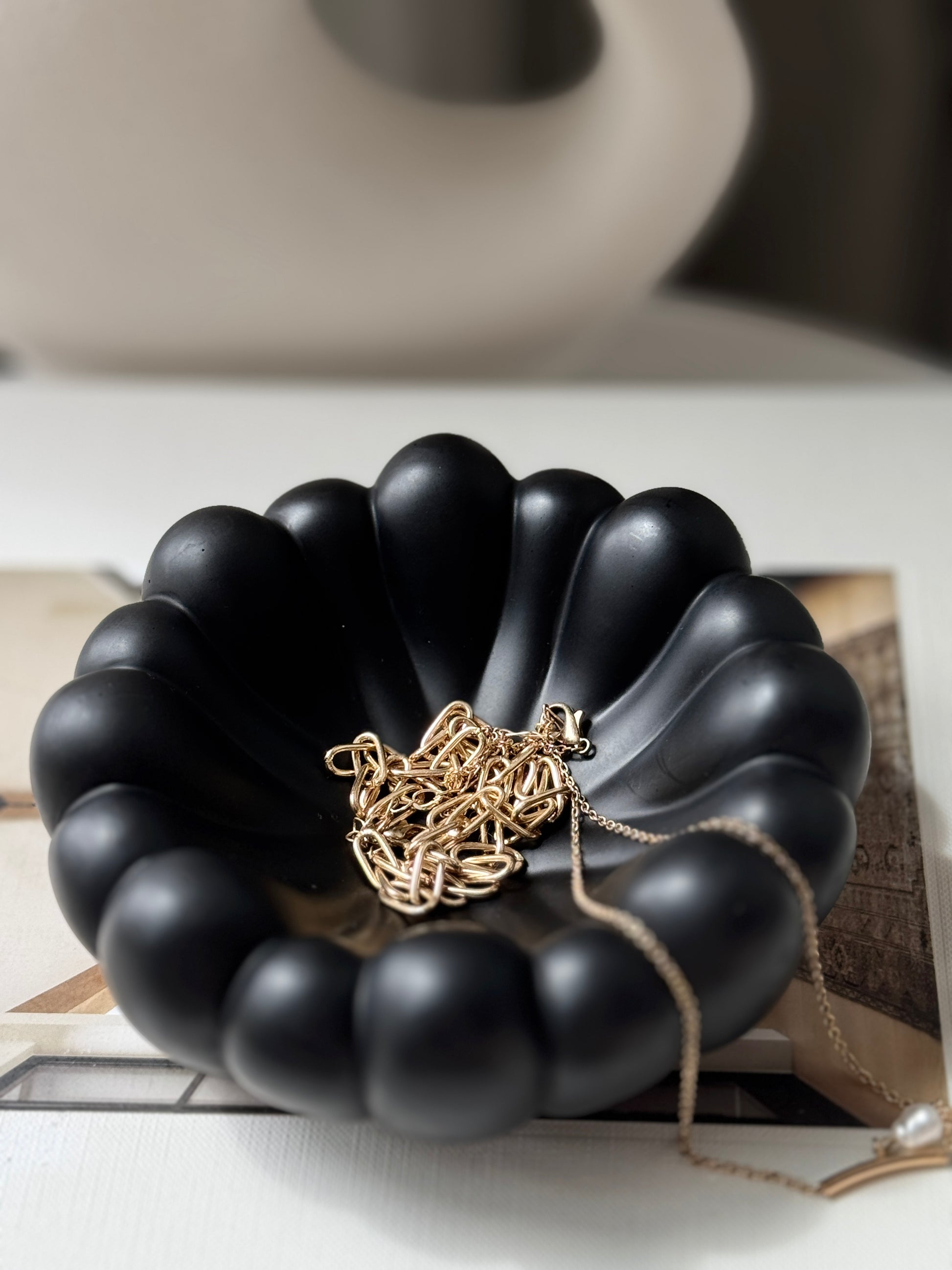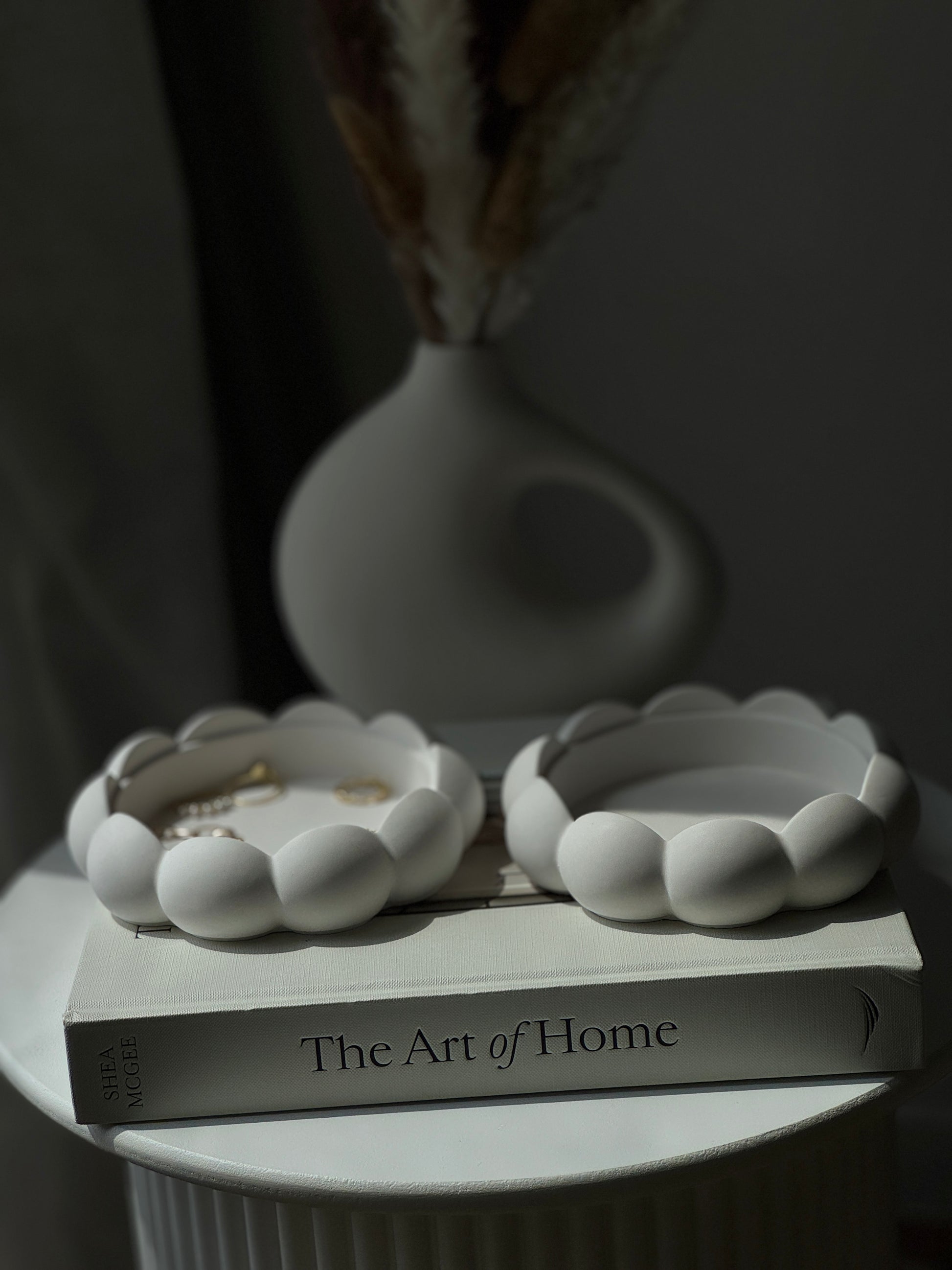A sculptural interpretation of playful softness, the Bubble Trays combine functionality with statement design. Handmade in black Jesmonite and white Porcelain, they bring a modern, minimal yet artistic touch to any space. Perfect for styling jewelry, candles, or small treasures.