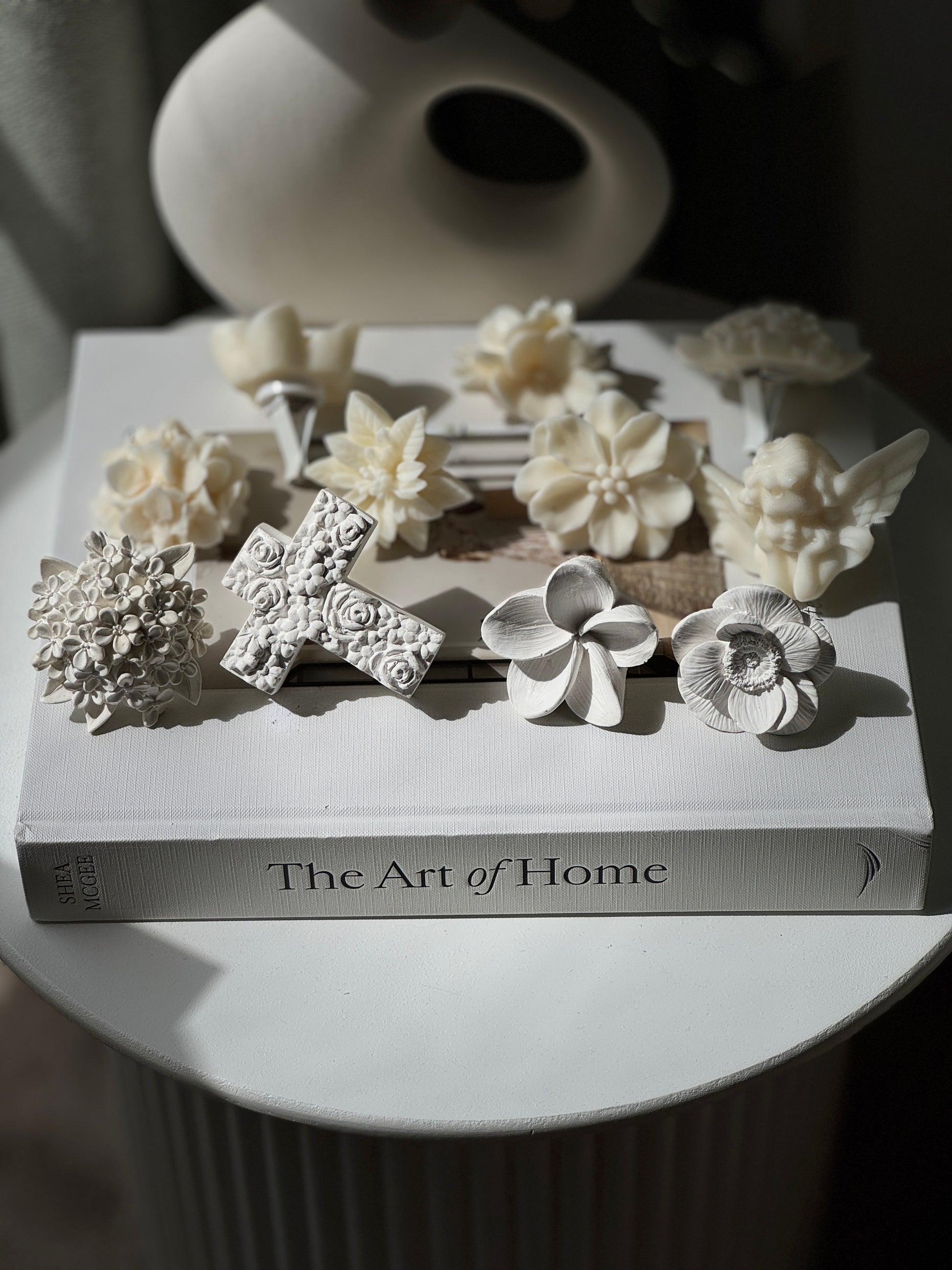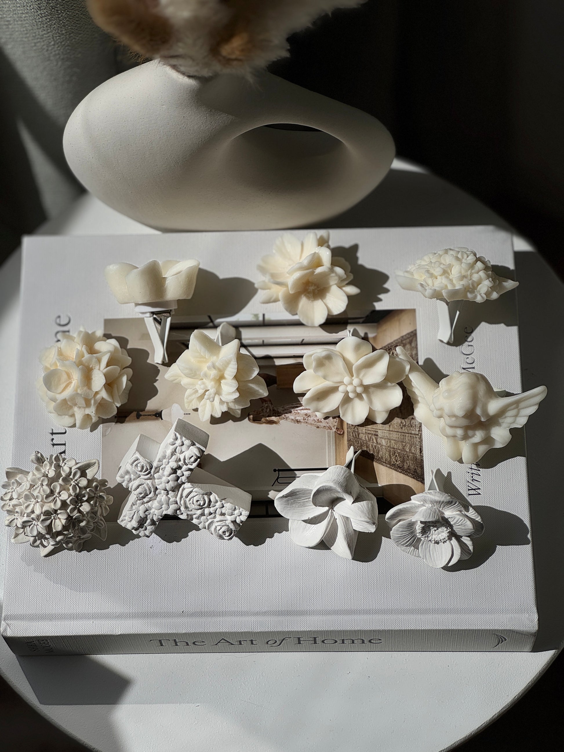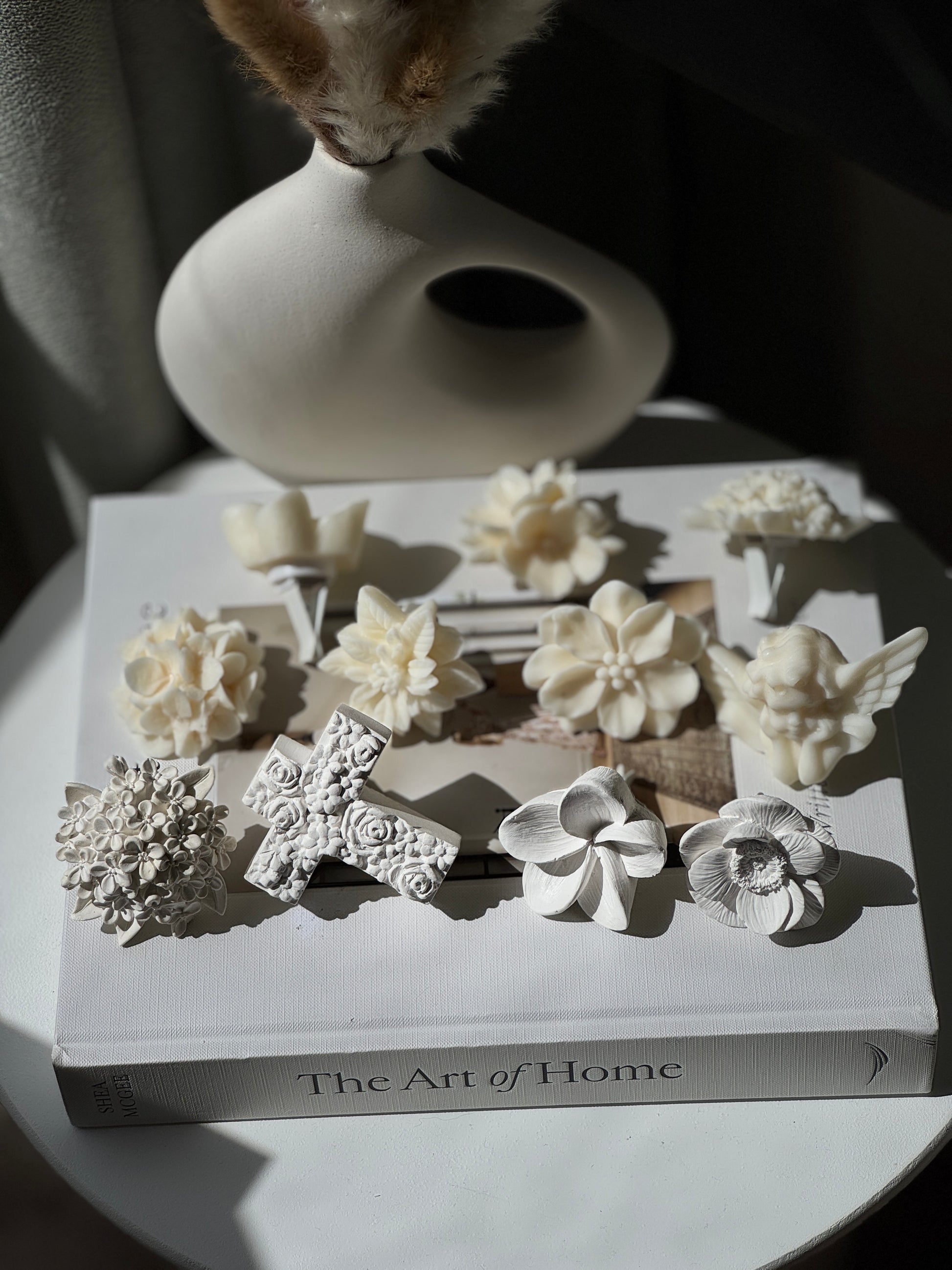A collection of 9 sculptural air freshener clips, each handmade from eco-resin and infused with long-lasting fragrance. Designed to clip easily in your car or home spaces, they transform everyday scenting into an artistic statement. With floral, angelic, and nature-inspired motifs, each piece is as beautiful as it is functional.