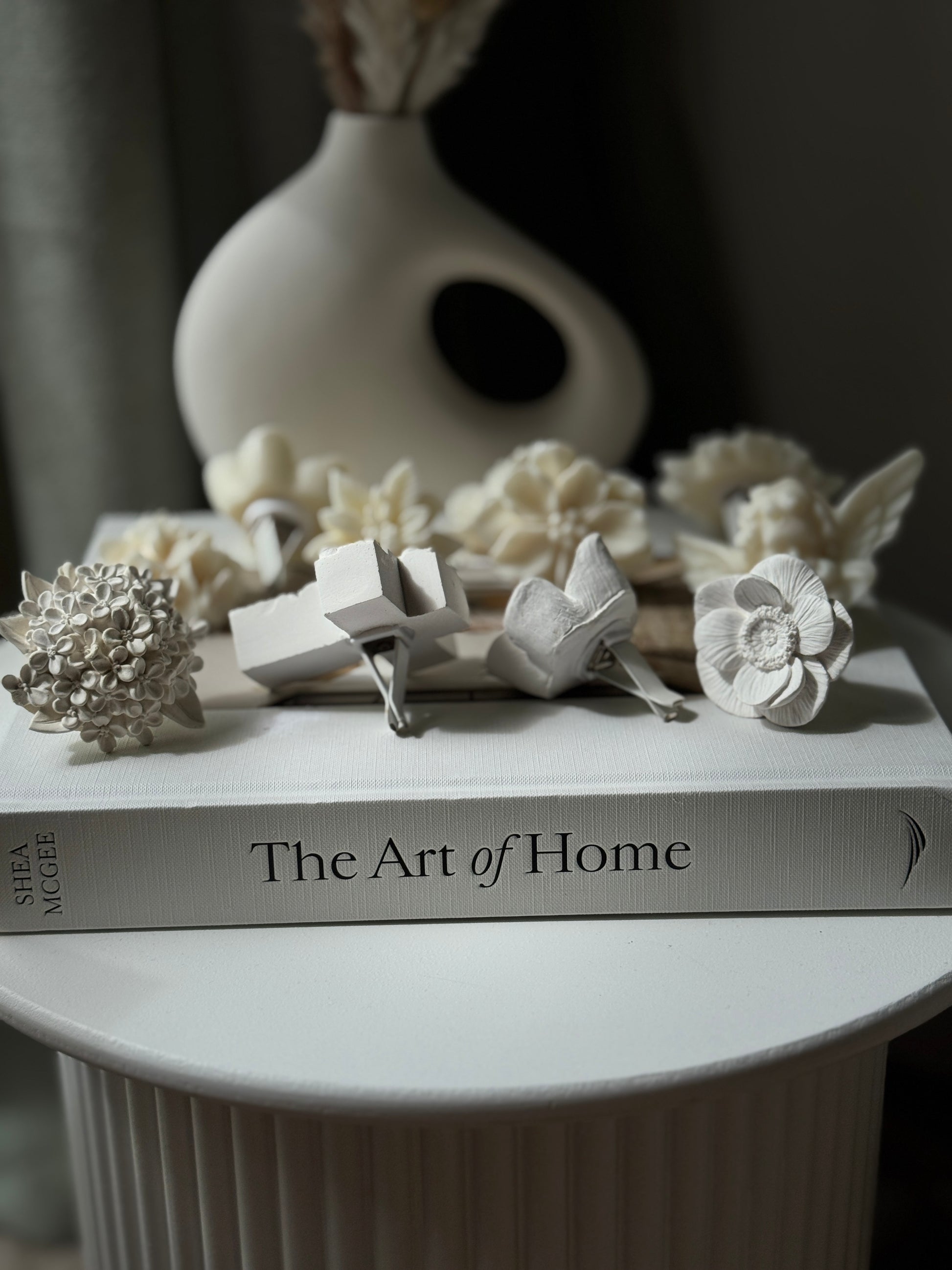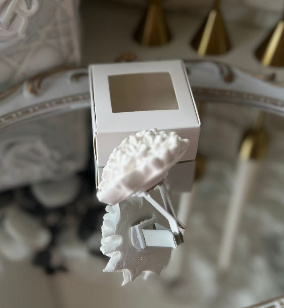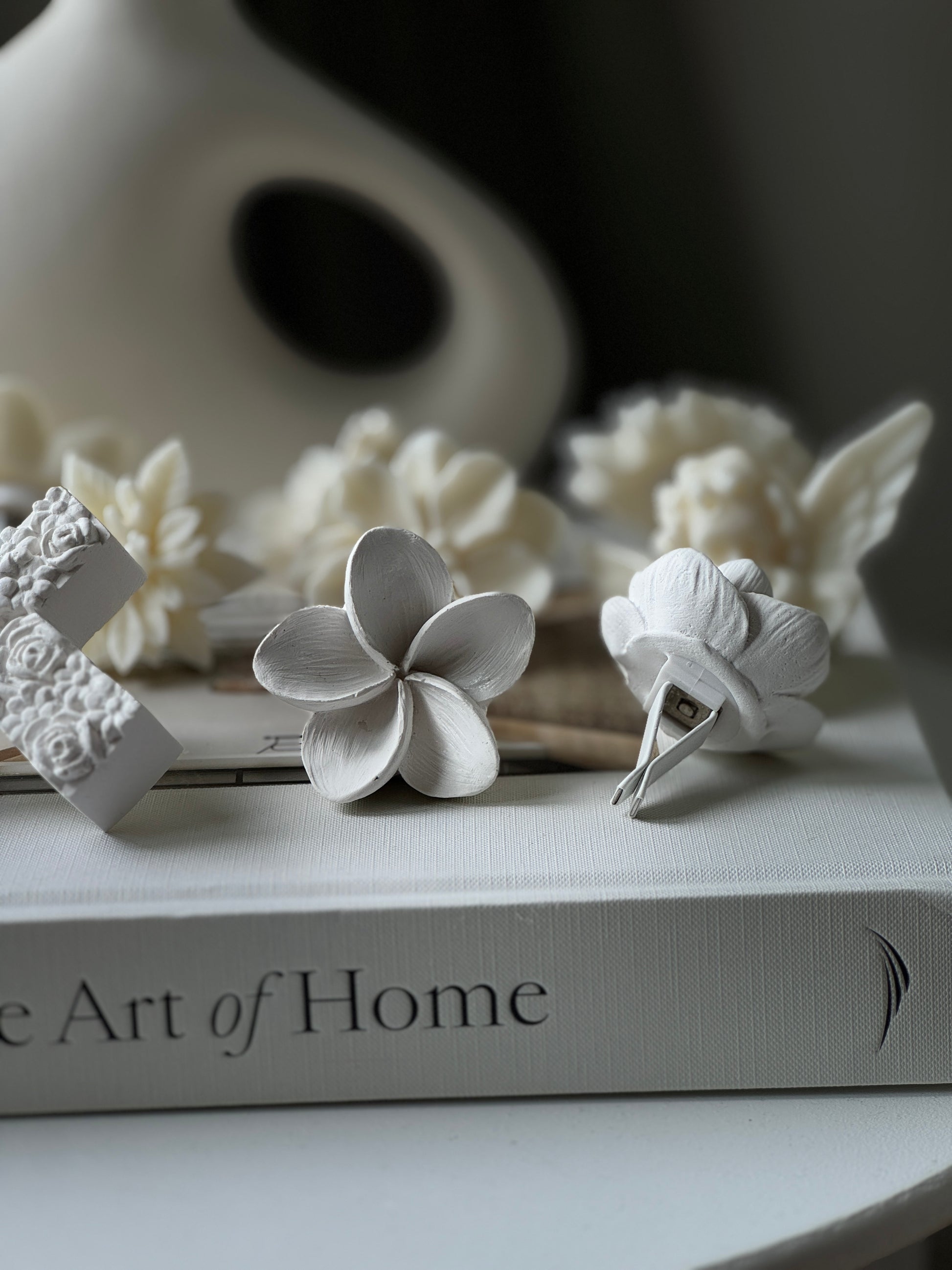 A collection of 9 sculptural air freshener clips, each handmade from eco-resin and infused with long-lasting fragrance. Designed to clip easily in your car or home spaces, they transform everyday scenting into an artistic statement. With floral, angelic, and nature-inspired motifs, each piece is as beautiful as it is functional.