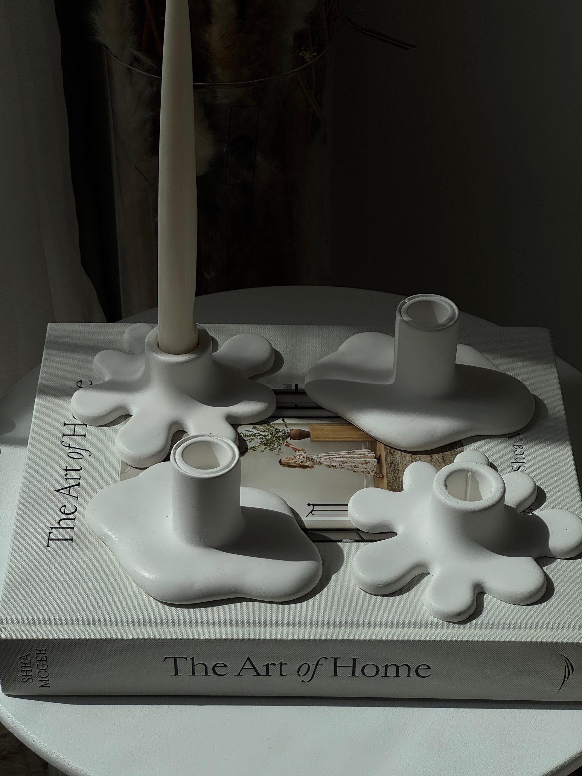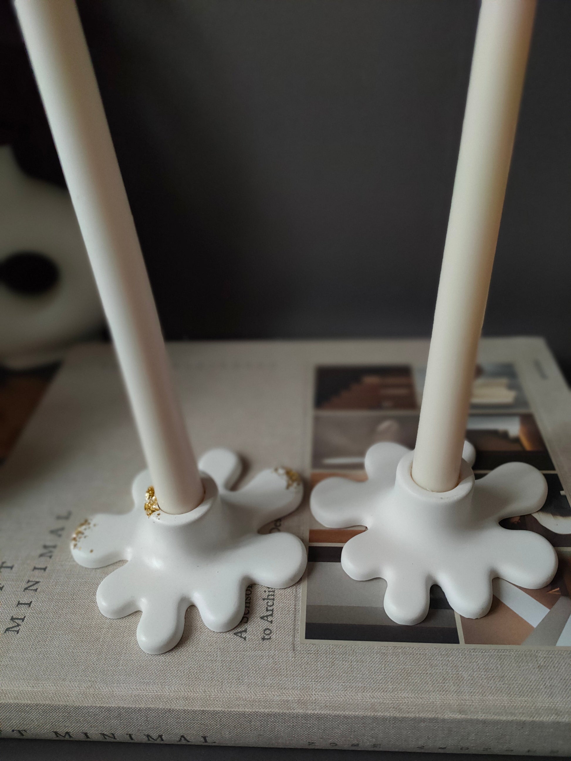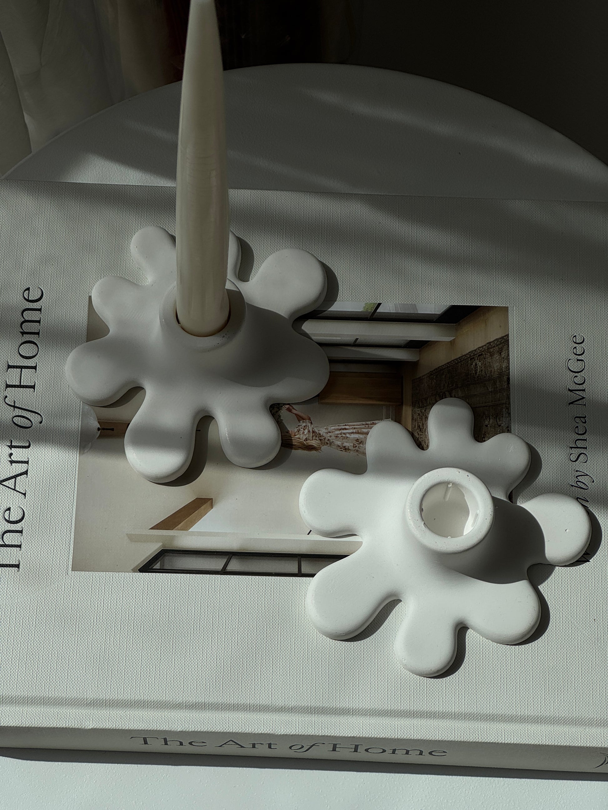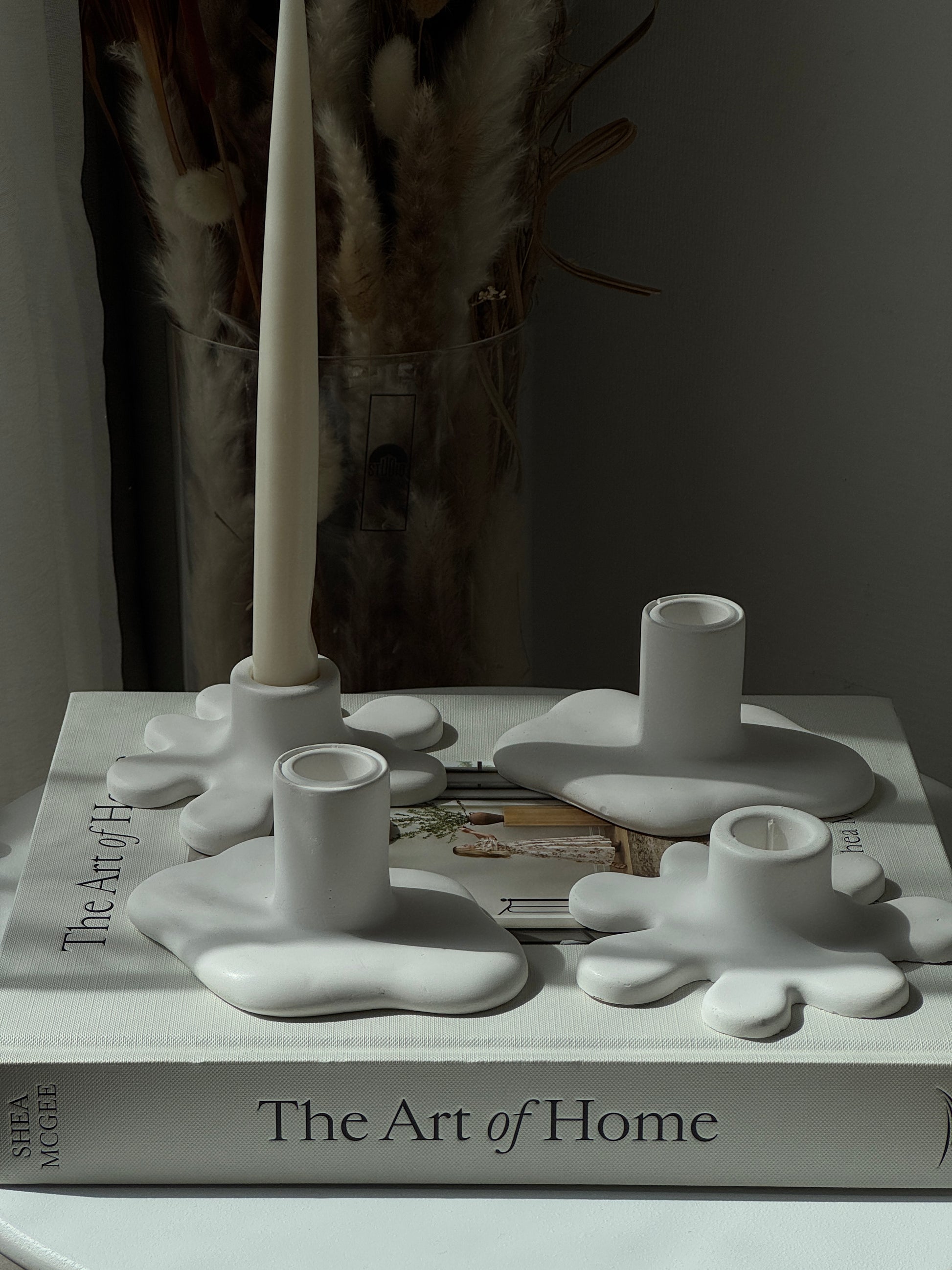 Two sculptural taper holders that bring playful, organic shapes into your home. Handmade with care, they are available in a classic matte finish or accented with shimmering gold stones for a luxurious touch. Each piece is designed to hold 2.2 cm taper candles, making them both functional and decorative.