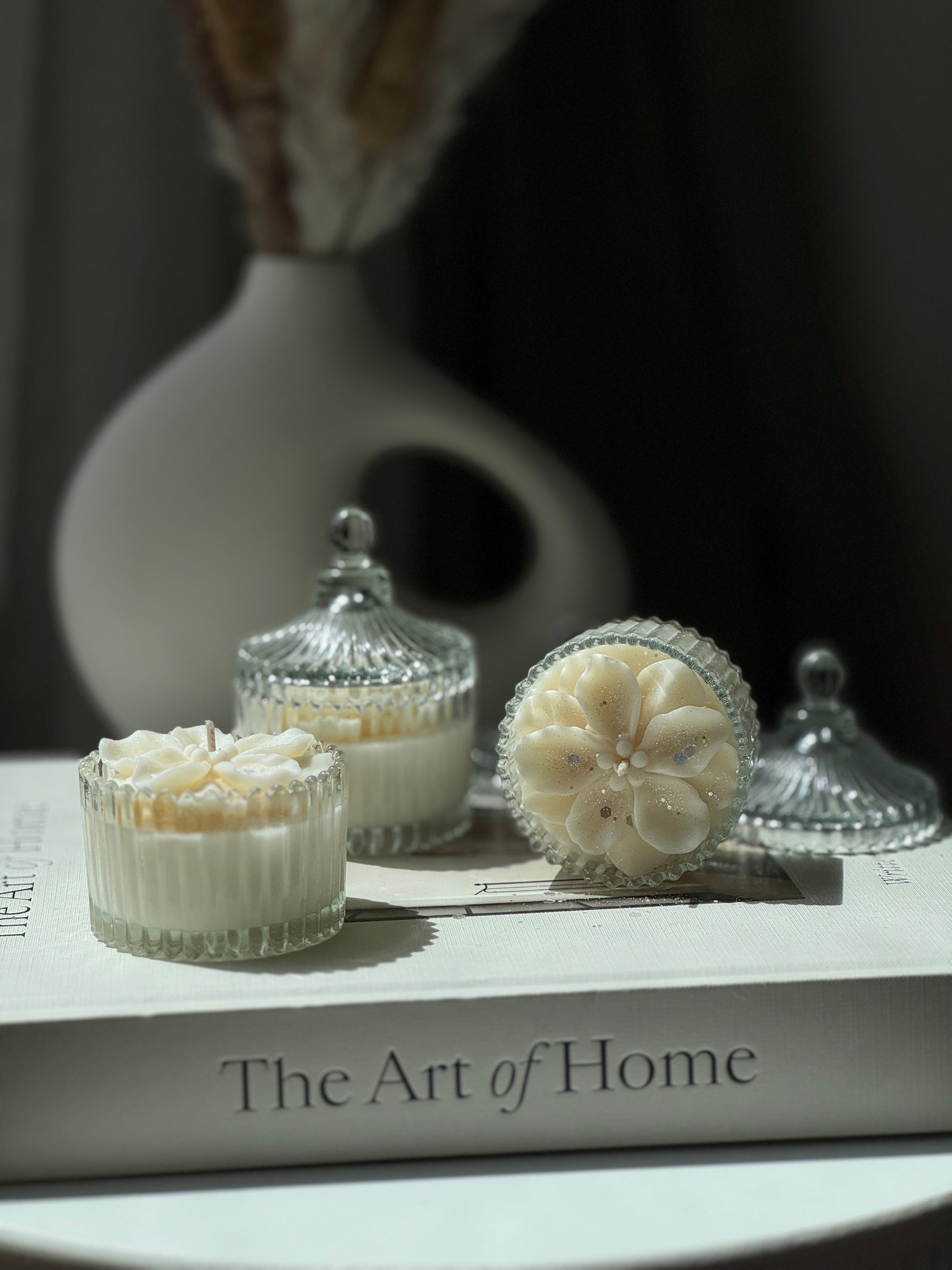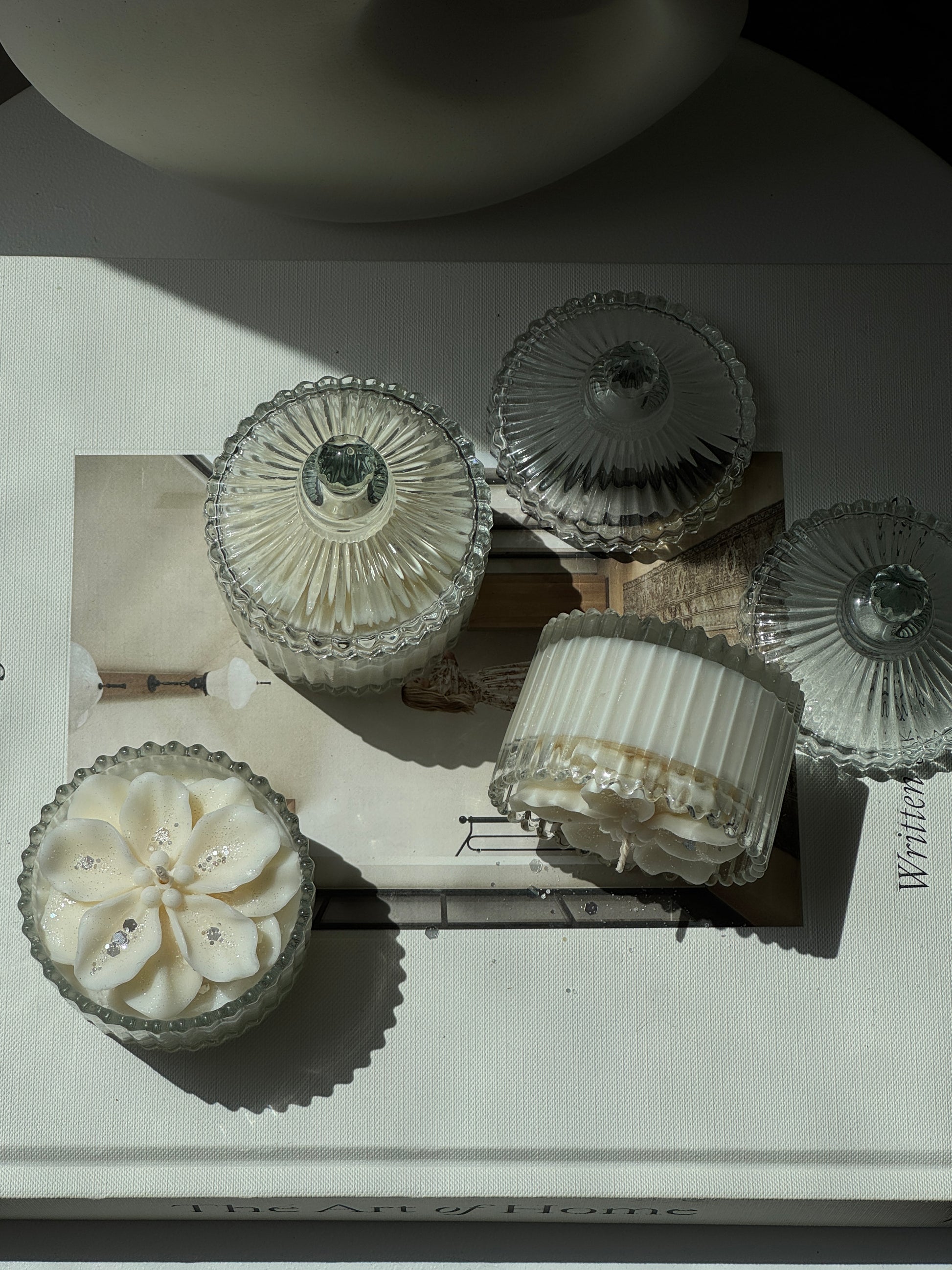 The Fleur de Noël candle combines festive charm with timeless elegance. Hand-poured in natural soy wax with a cotton wick, it blooms with a sculpted wax flower dusted in delicate shimmer. Housed in a ribbed glass jar with a matching lid, it is as much a decorative piece as it is a candle.