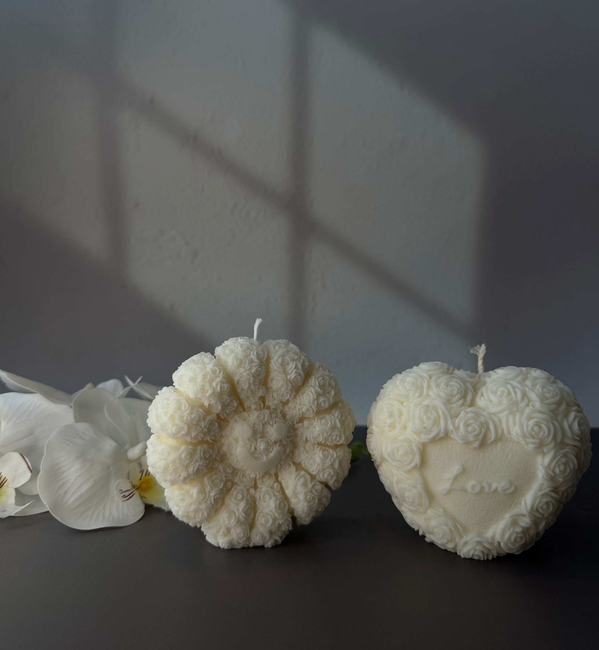 A romantic heart-shaped candle, intricately adorned with blooming roses and a raised heart center inscribed with the word Love. Hand-poured from eco-friendly soy wax, it’s perfect for weddings, anniversaries, or as a meaningful gift for someone special.