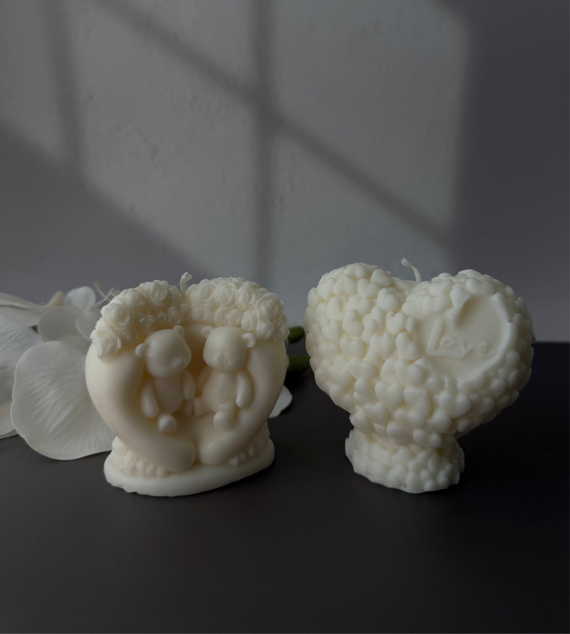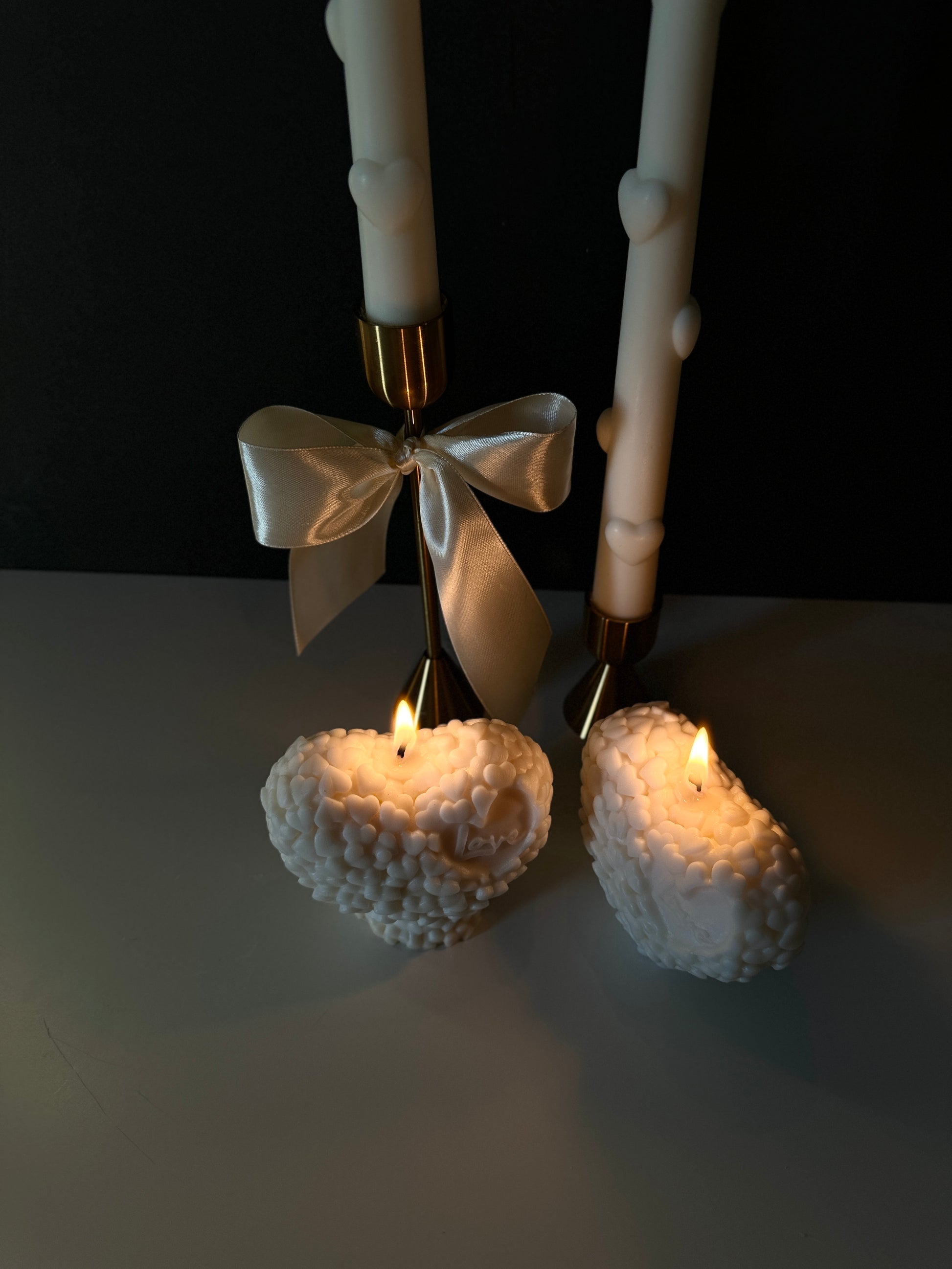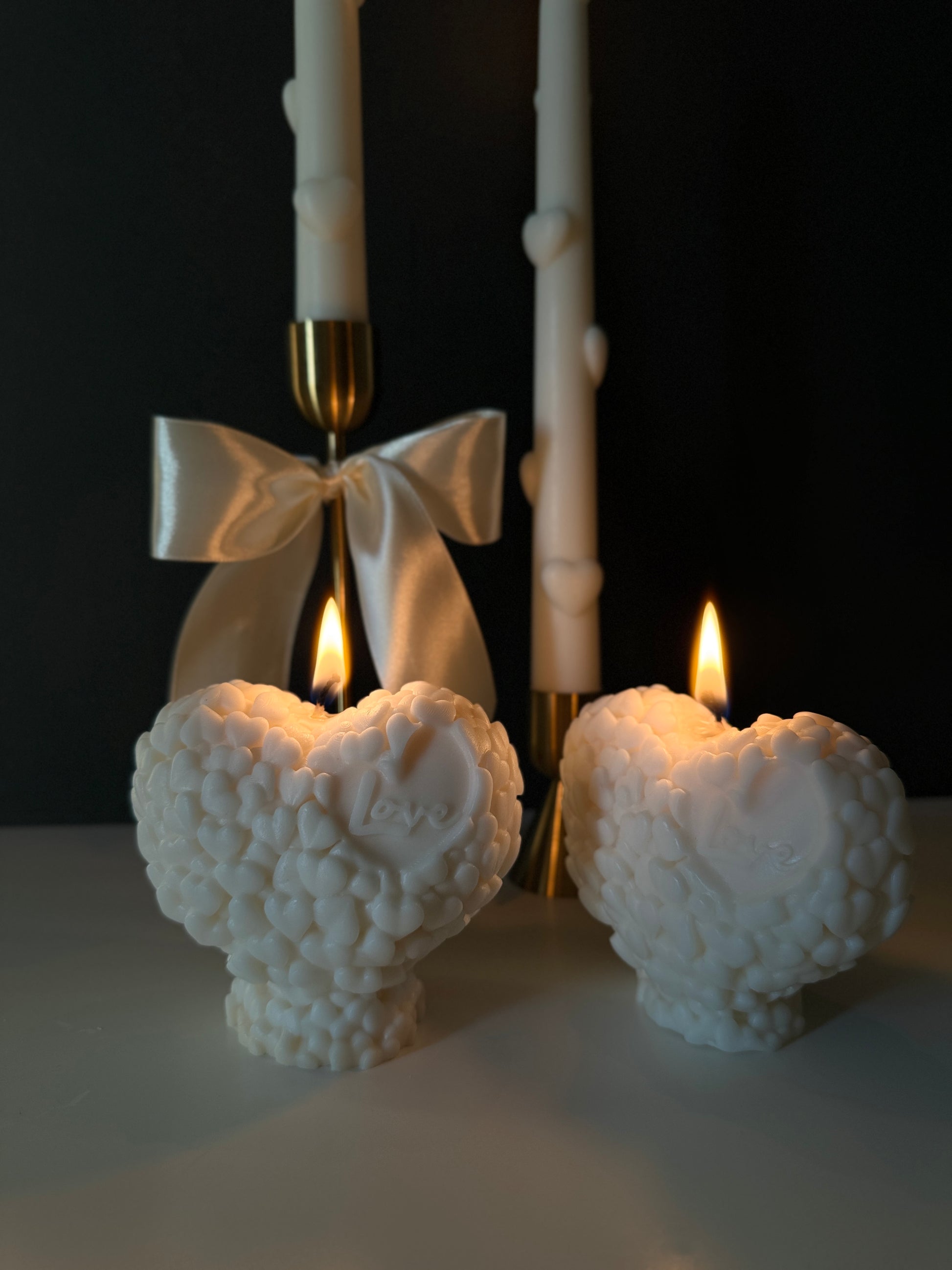 A stunning heart-shaped candle adorned with delicate mini hearts, embossed with the word “Love.” This piece radiates warmth and romance, making it the perfect centerpiece or heartfelt gift.