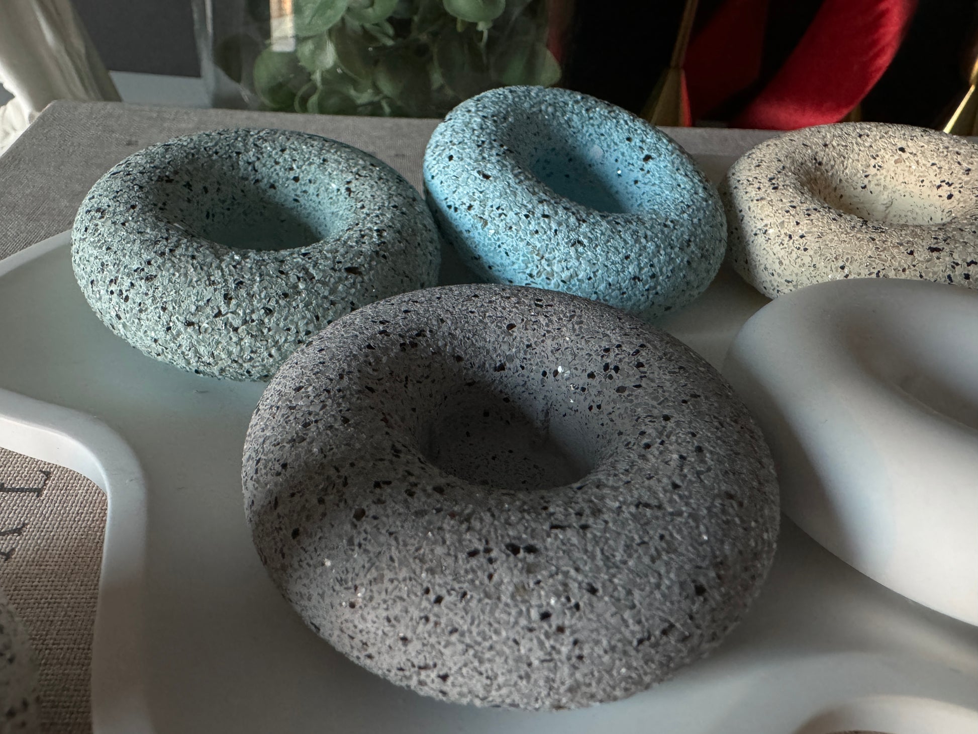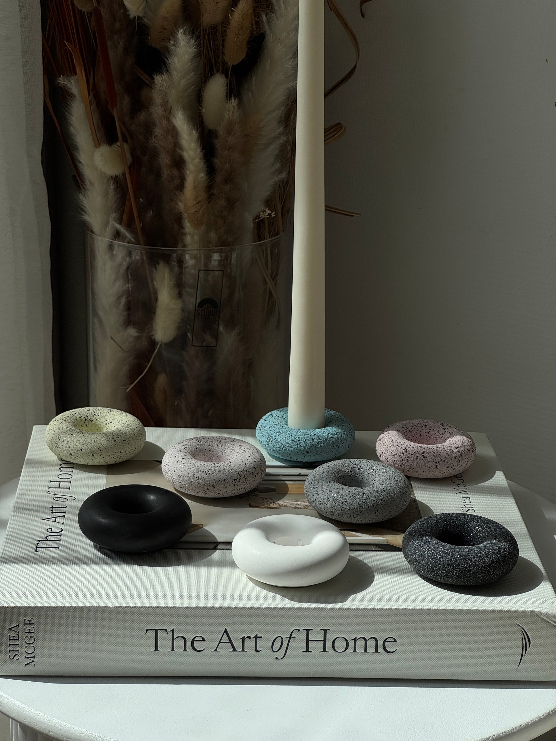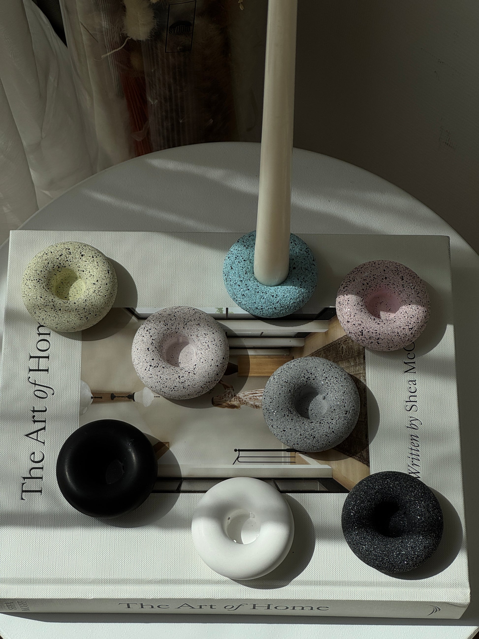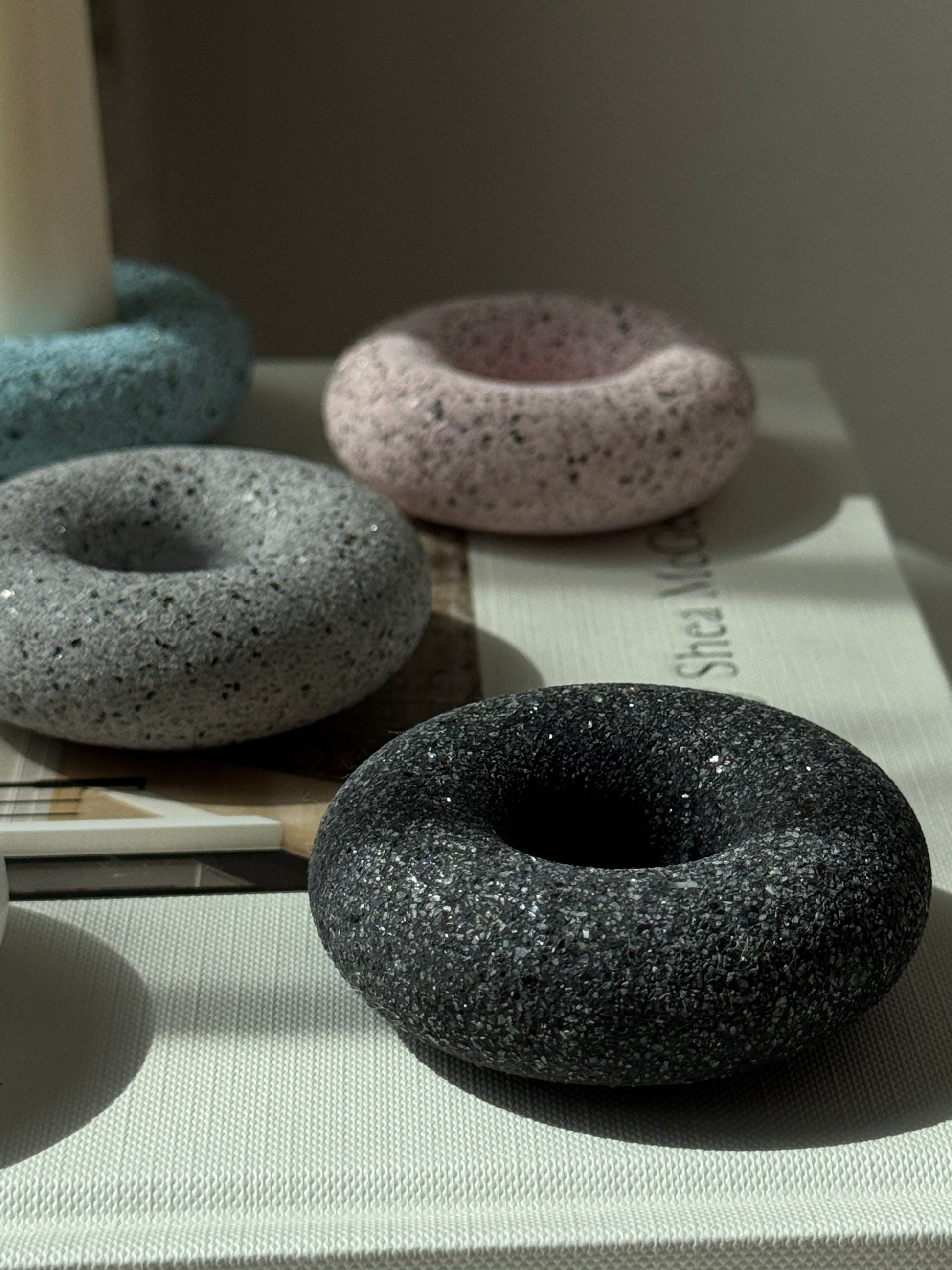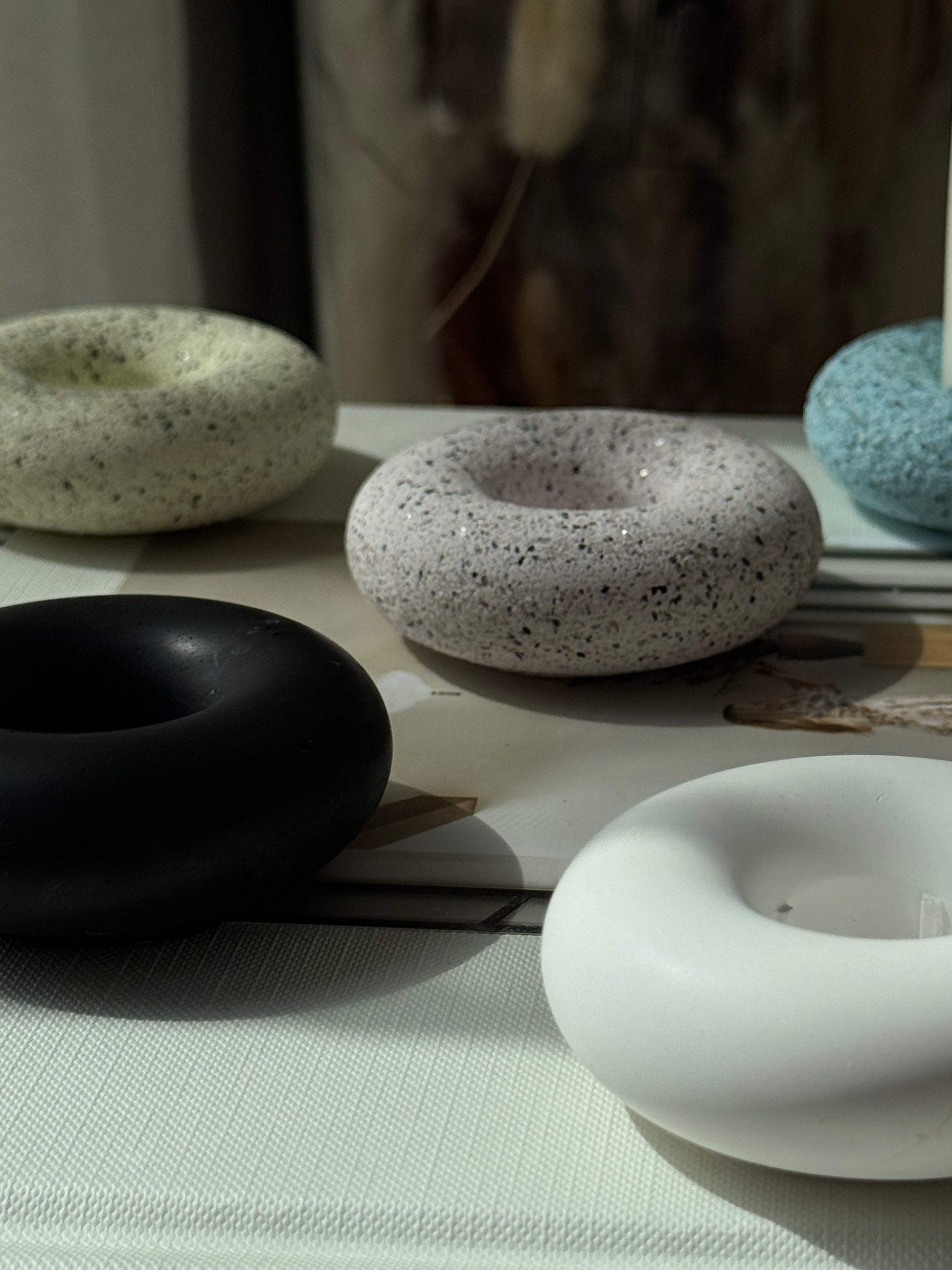 Handcrafted with care, these round donut-shaped taper holders bring a modern yet organic feel to your home. Their smooth curves and granite textures make them a versatile accent for any space, from cozy dinners to timeless centerpieces.