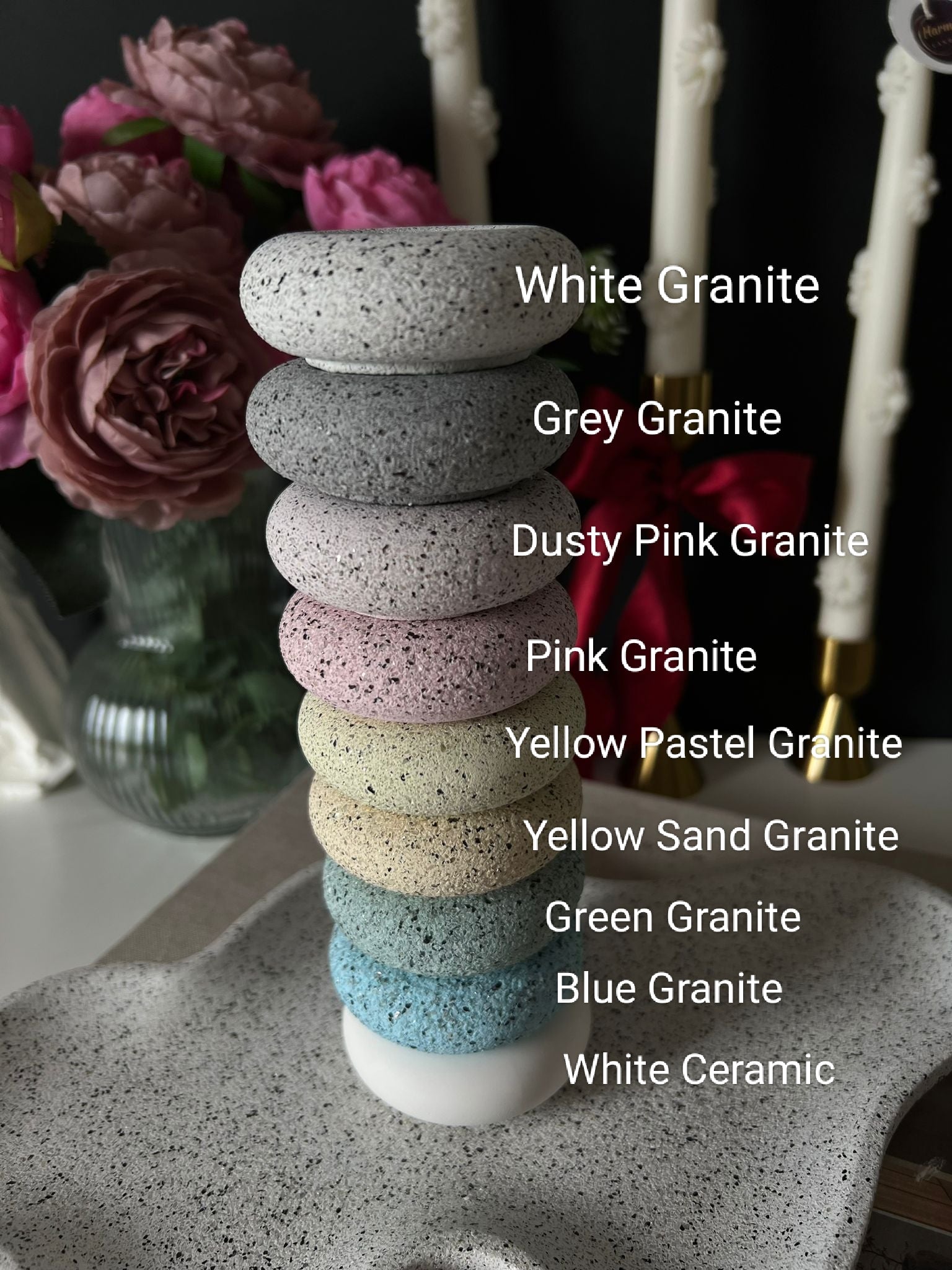Each holder is designed to fit standard 2.2 cm taper candles and is available in a wide range of granite shades to suit your style.