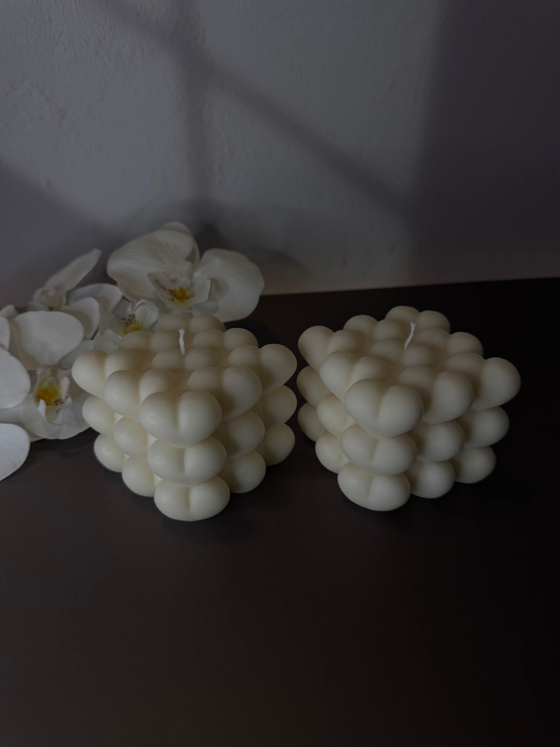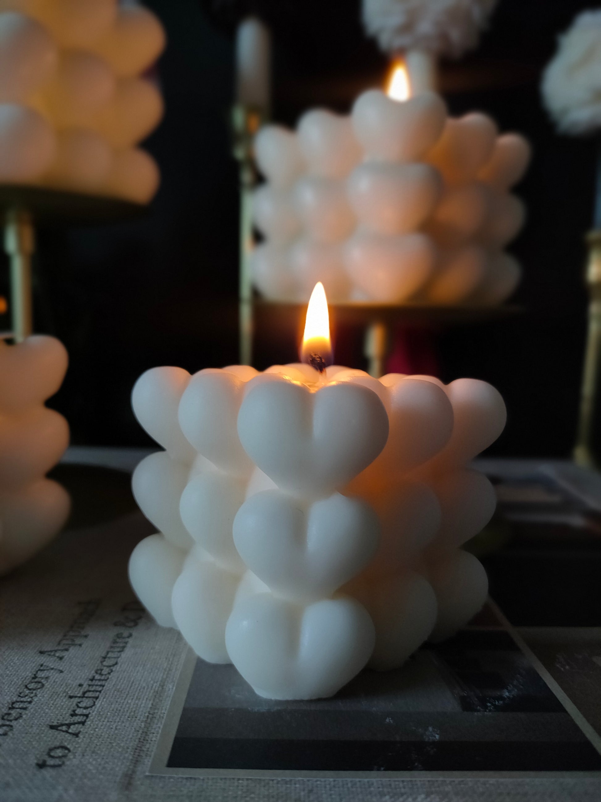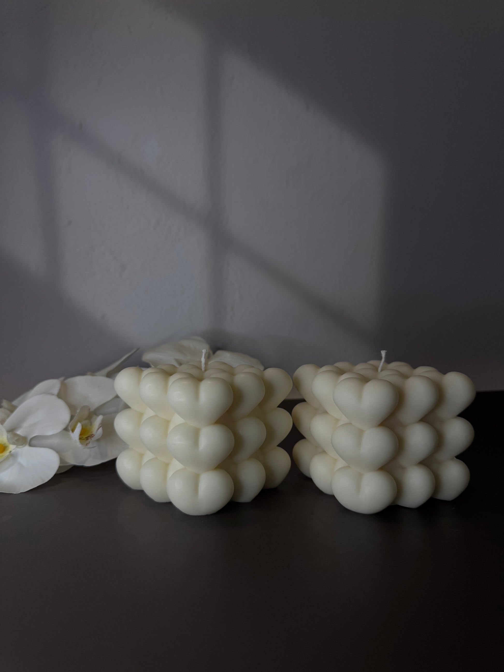 A charming cube of stacked hearts, crafted from soft soy wax. Its playful shape radiates affection and makes the perfect romantic accent or gift.