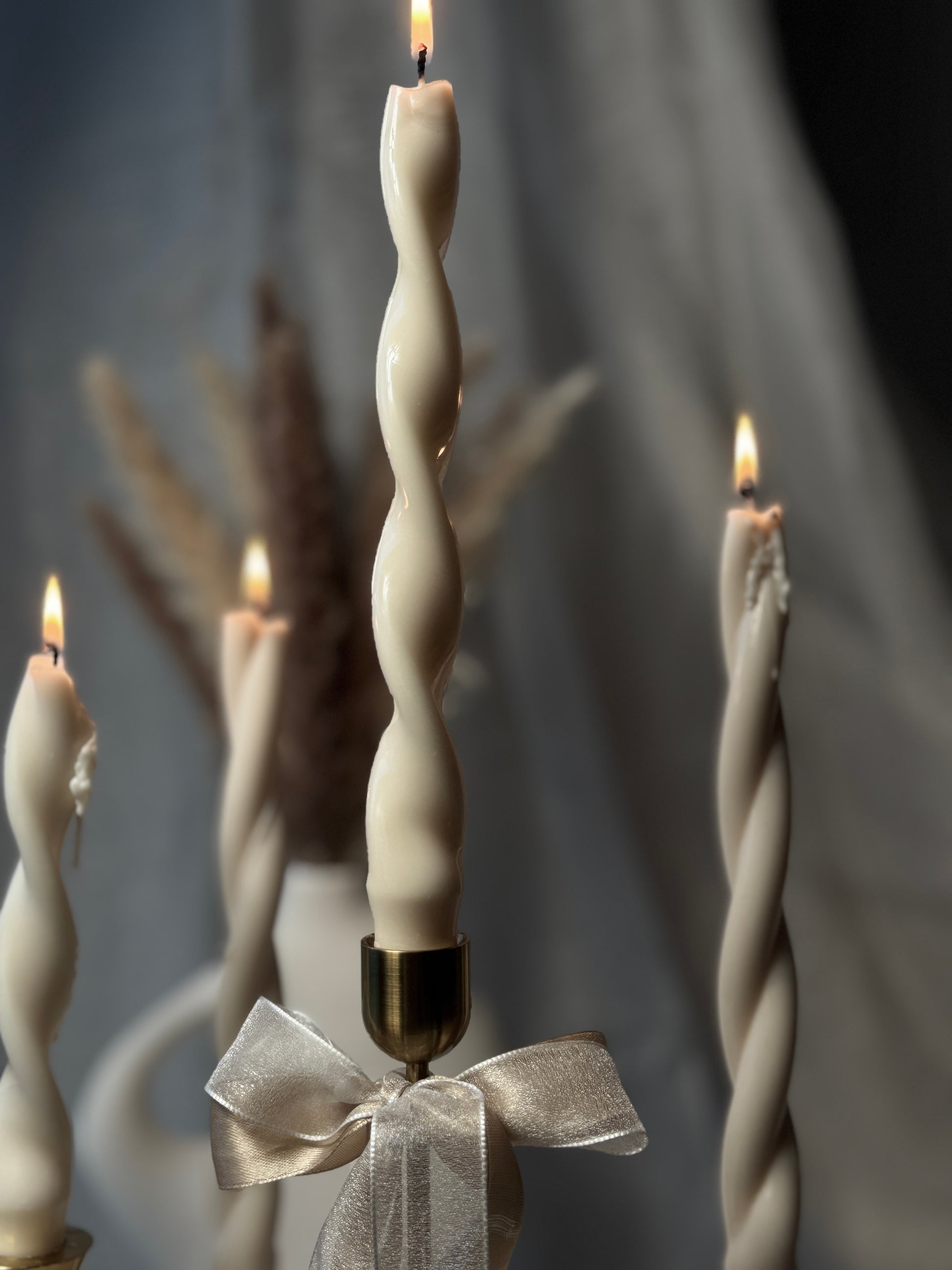 A tall, elegant taper candle with a flowing twisted form. Its slim silhouette adds height and modern sophistication to any candle holder or table setting.