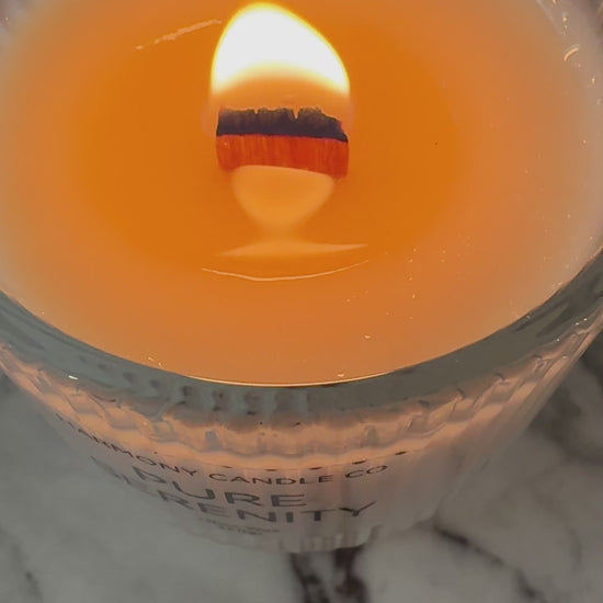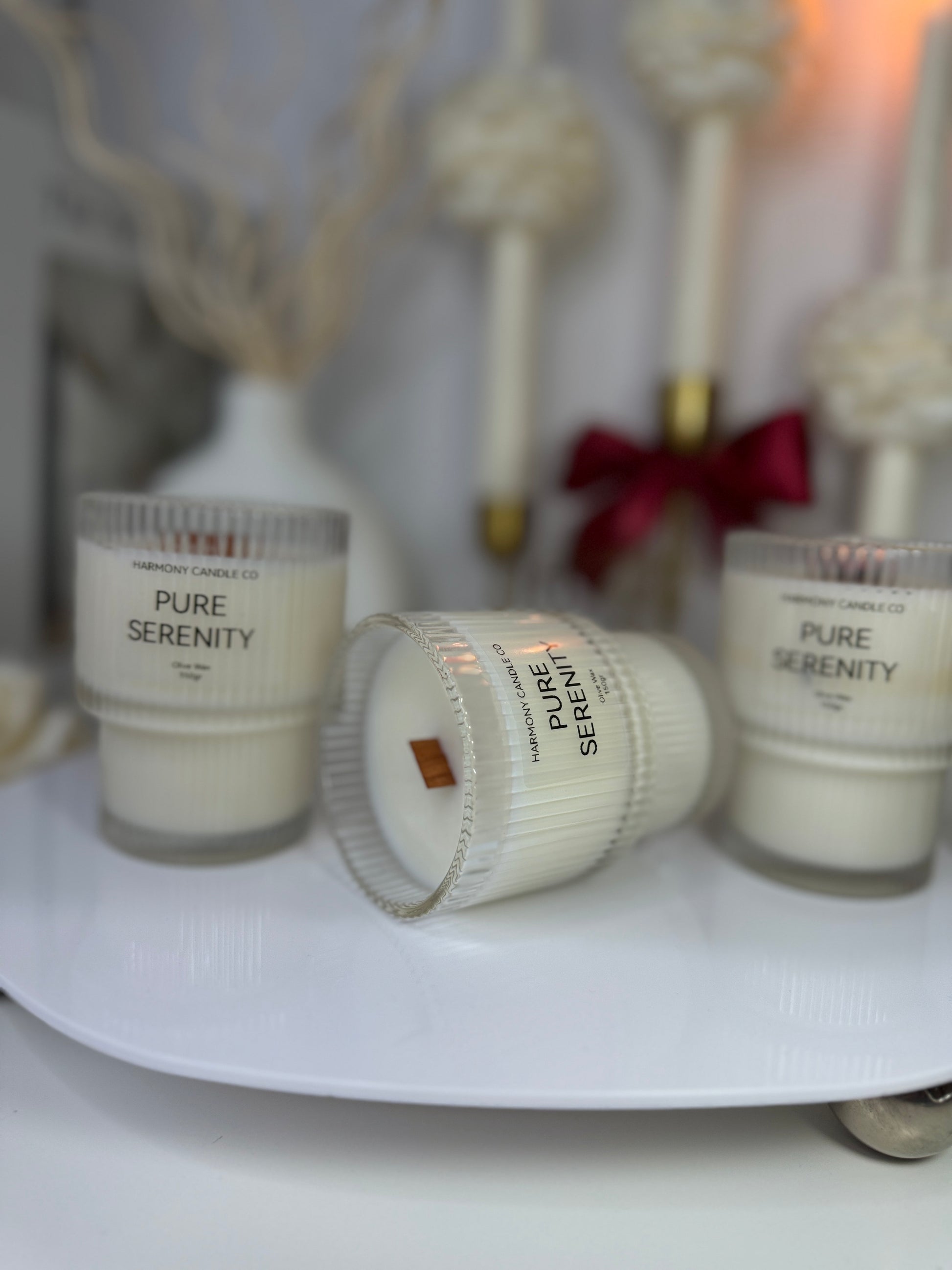 Pure Serenity is a gentle invitation to slow down. Hand-poured using sustainable olive wax and centered with a natural wood wick, this candle offers a clean, soothing burn with a soft crackle that mimics the comfort of a distant hearth.
