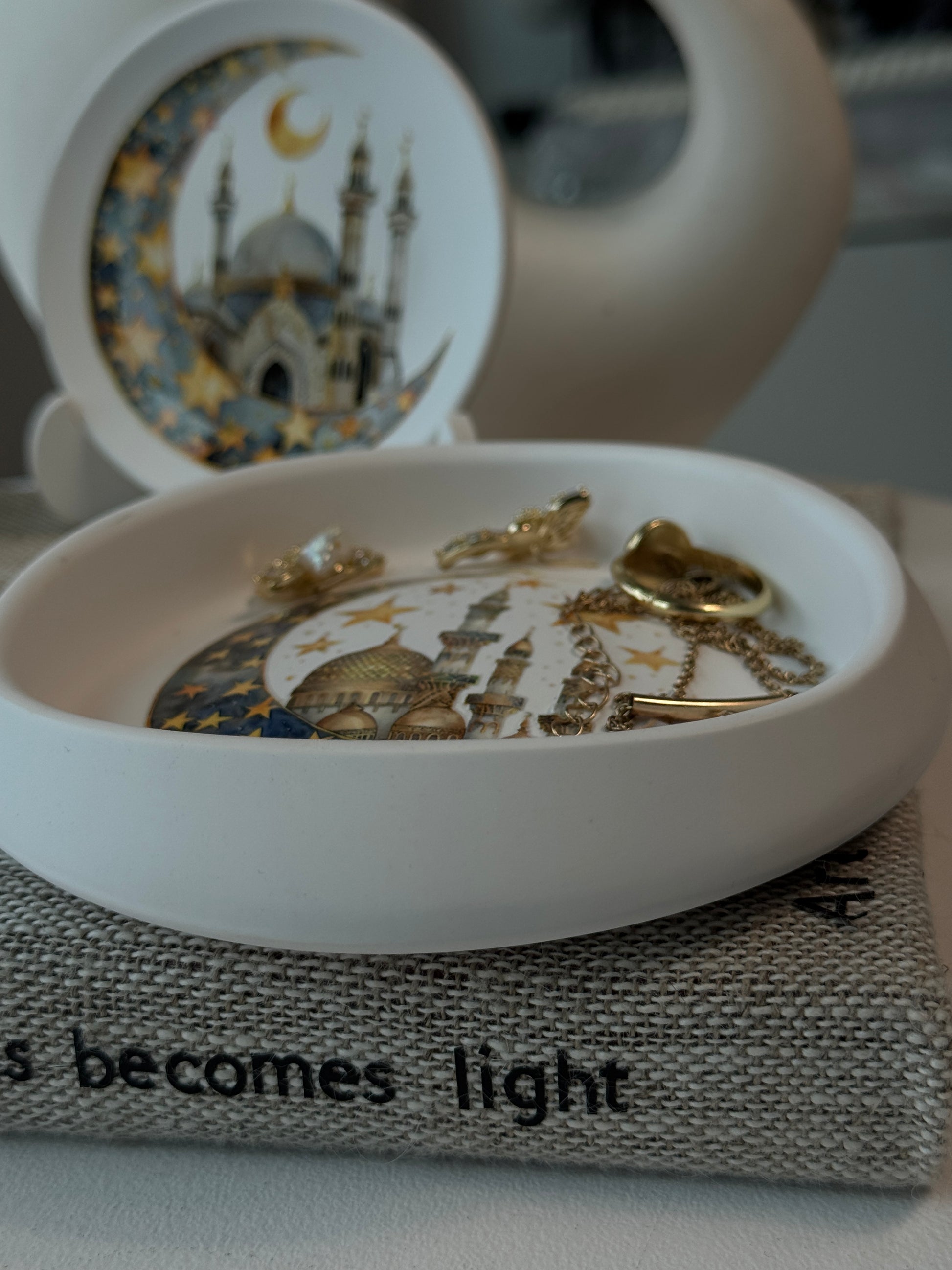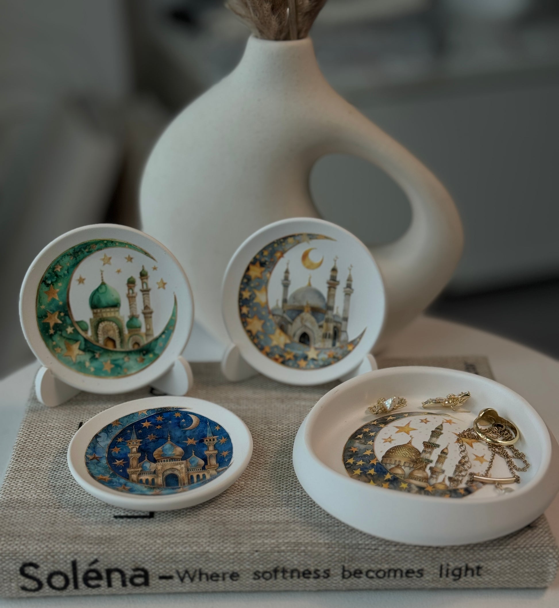 Inspired by crescent moons, mosque architecture and sacred night skies, this collection blends minimal design with meaningful symbolism — perfect for Ramadan decoration, Iftar table styling and Eid gifts.