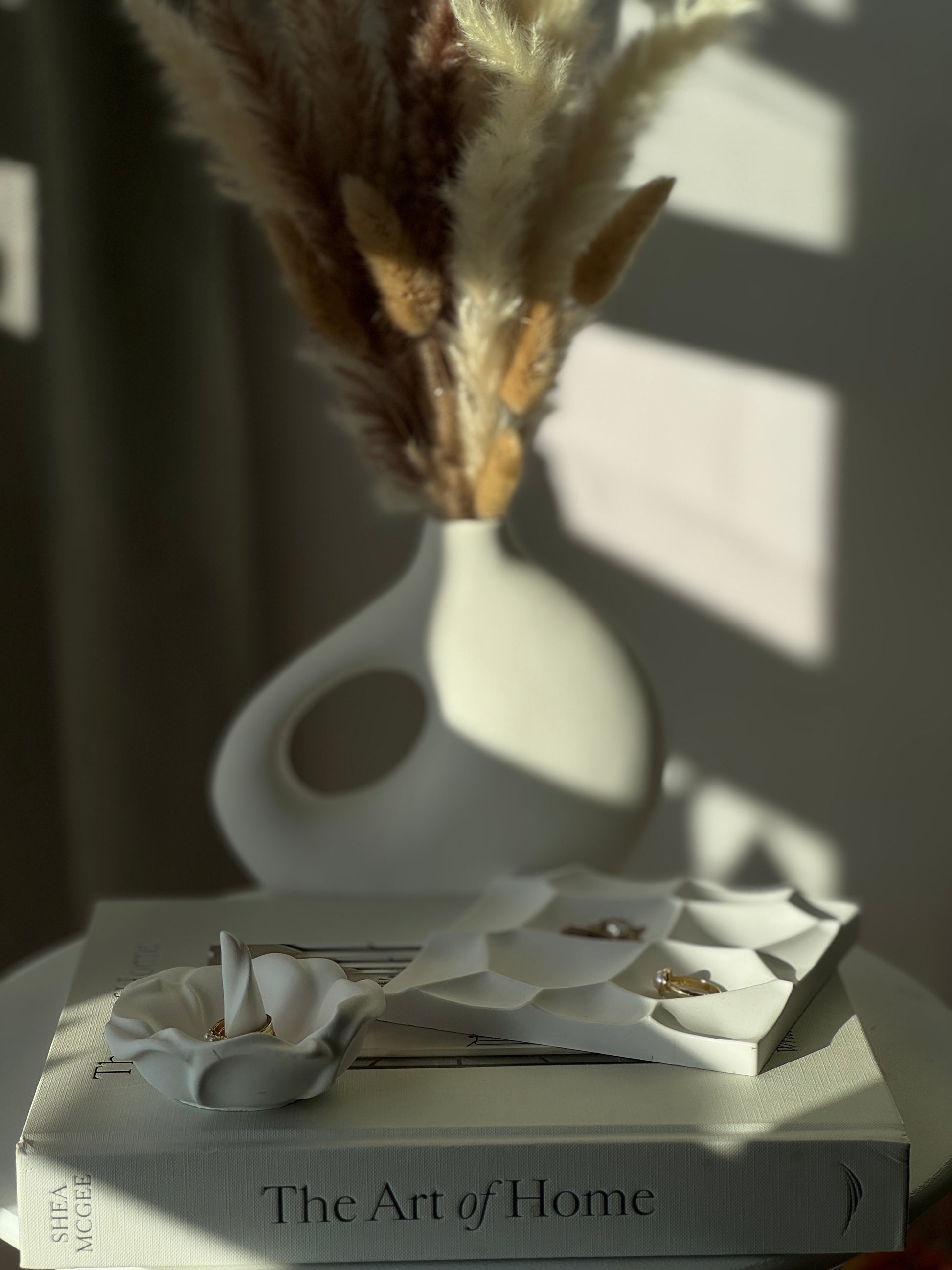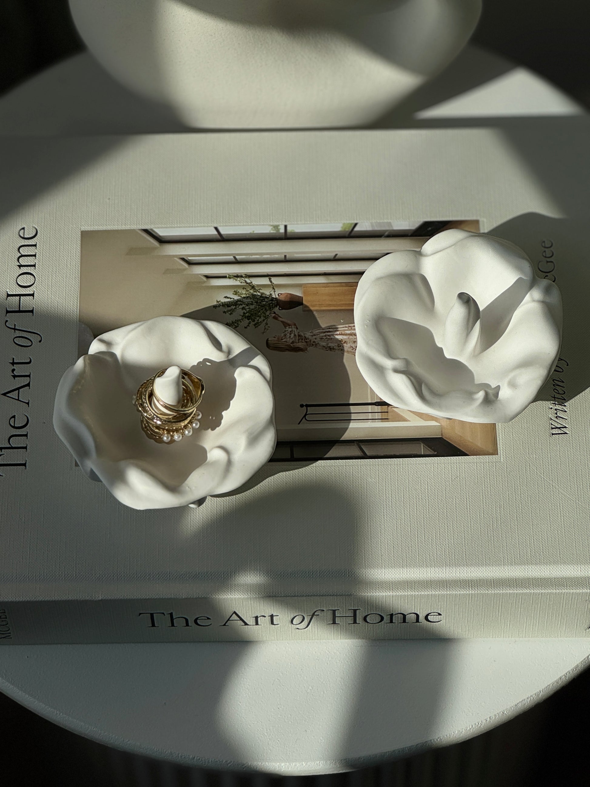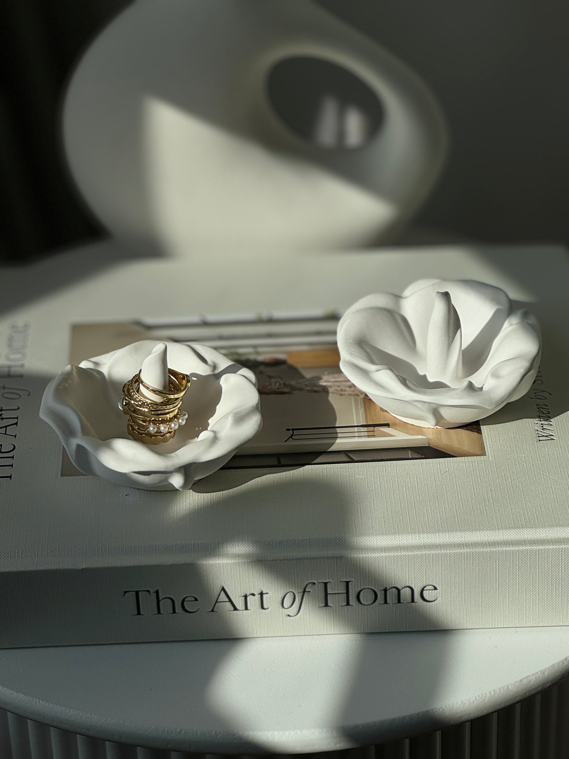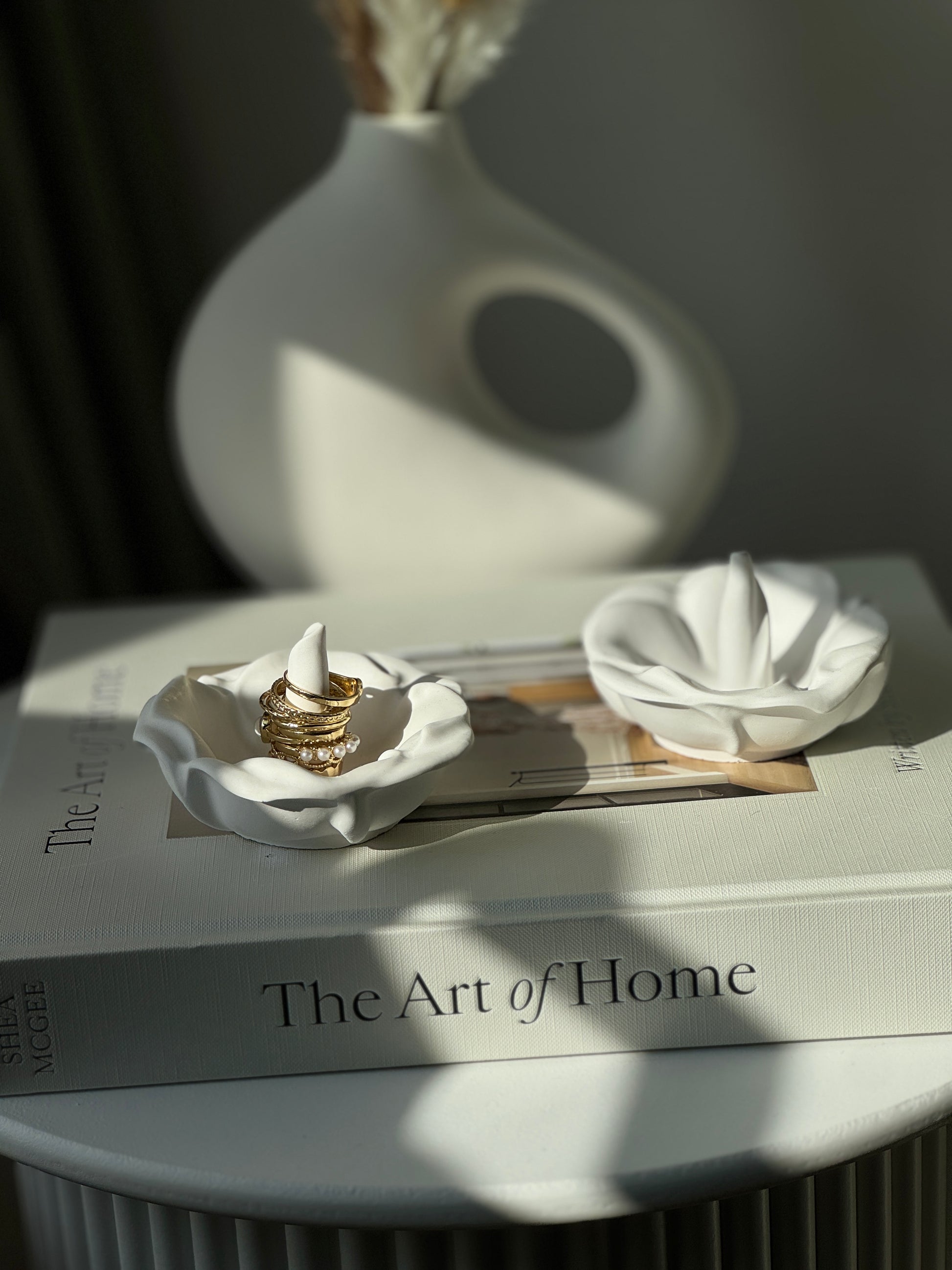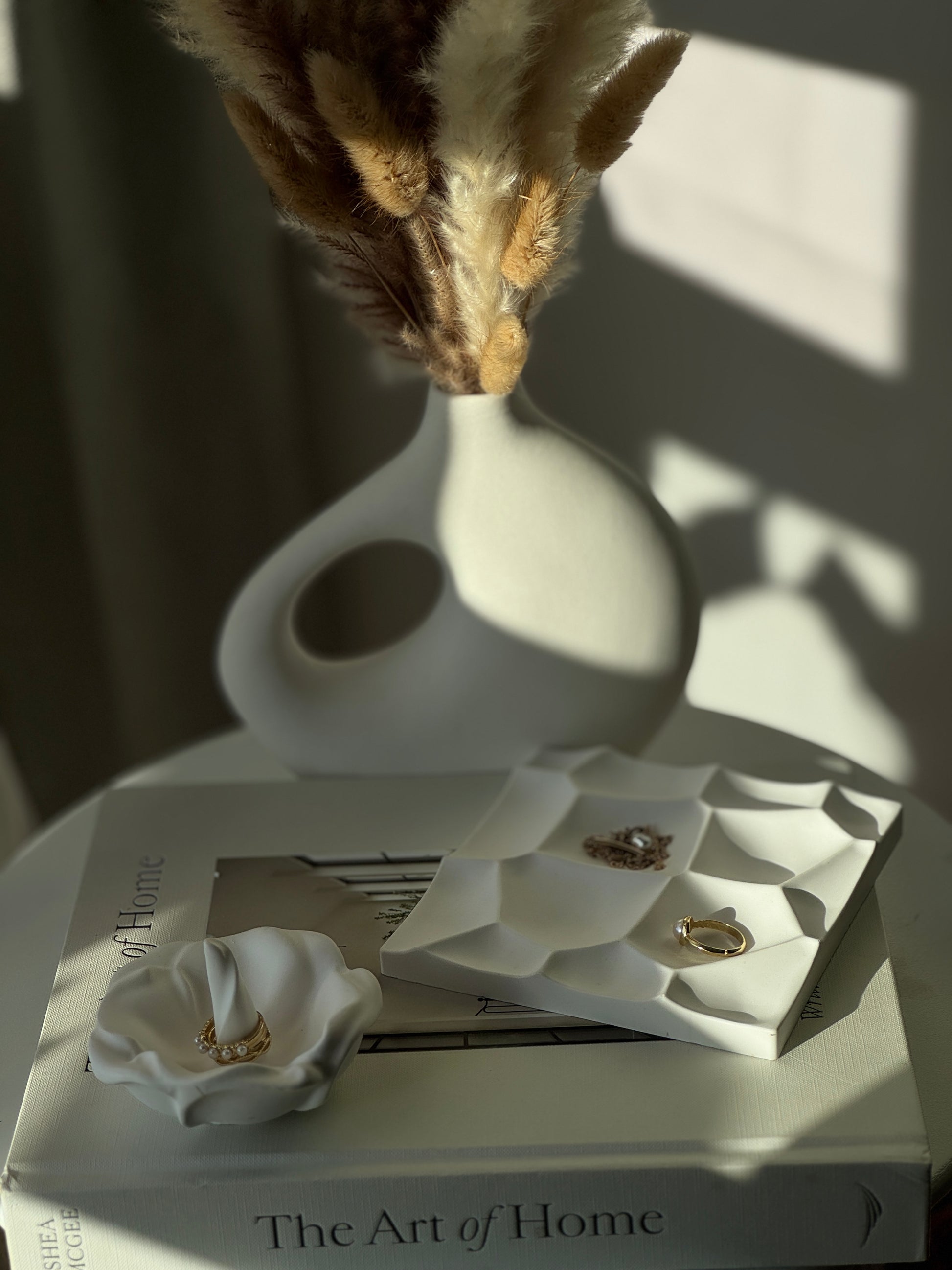 The Fleur Ring Holder captures the delicate beauty of a blooming flower, offering a safe and poetic display for your rings. Beside it, the Geometric Square Tray brings modern minimalism with its faceted surface, perfect for organizing jewelry or simply adorning your space with quiet sophistication.