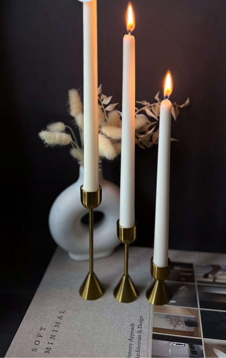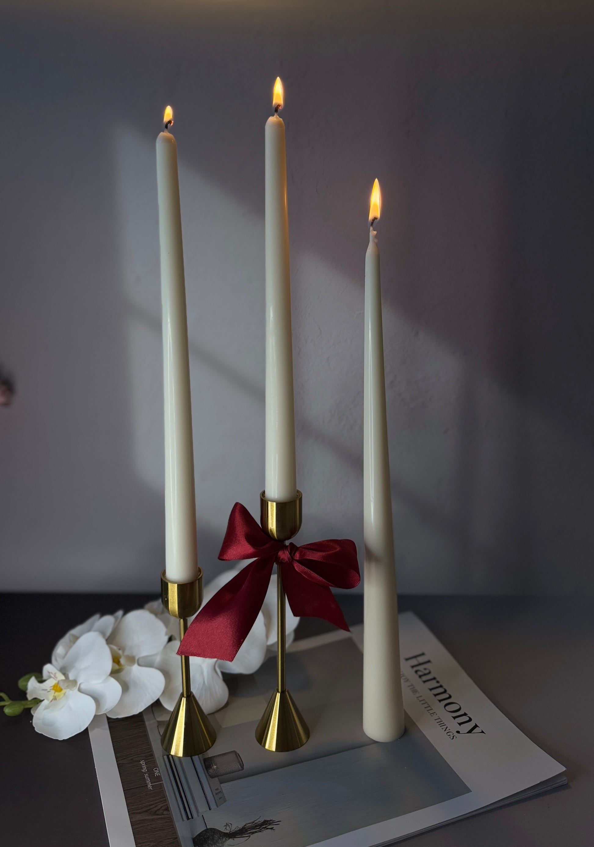 These classic taper candles embody timeless style and sophistication. Hand-poured from eco-friendly soy wax, each one offers a smooth, refined silhouette that elevates any setting—whether it’s a romantic dinner, a festive occasion, or an everyday moment of calm. Available in three versatile heights, they stand beautifully alone or grouped for striking dimension.