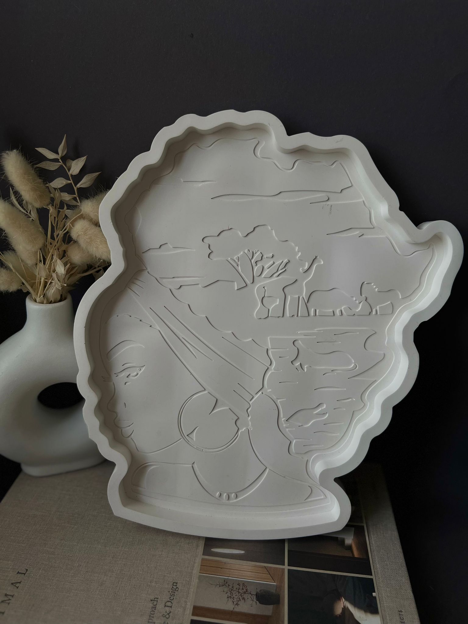 Celebrate culture and craftsmanship with the Afra Tray – a striking handmade piece shaped in the silhouette of a woman’s profile, detailed with minimalist reliefs of nature and tradition. With its sculptural form and subtle matte texture, this tray is a functional work of art made to elevate your styling or storage space.