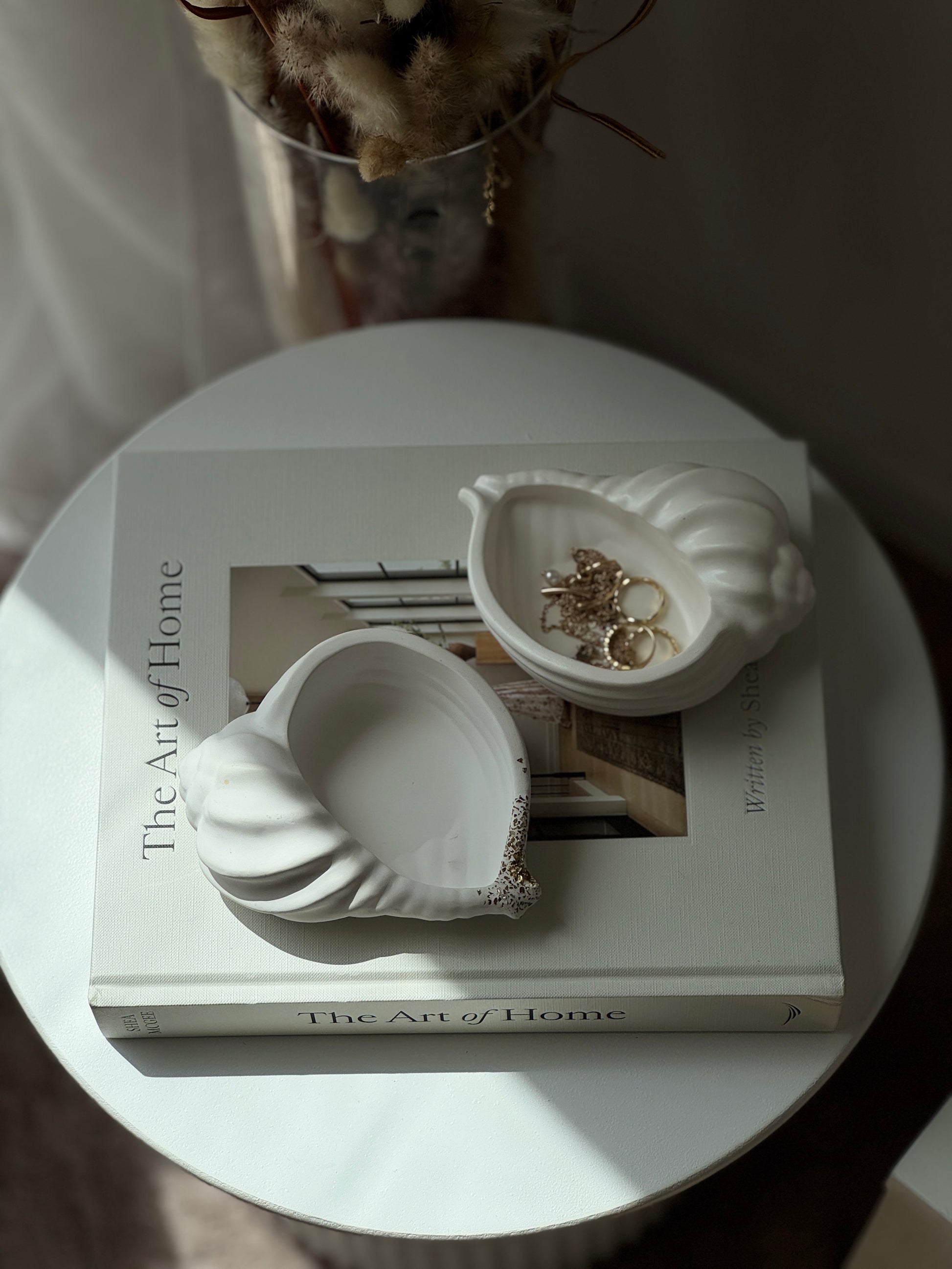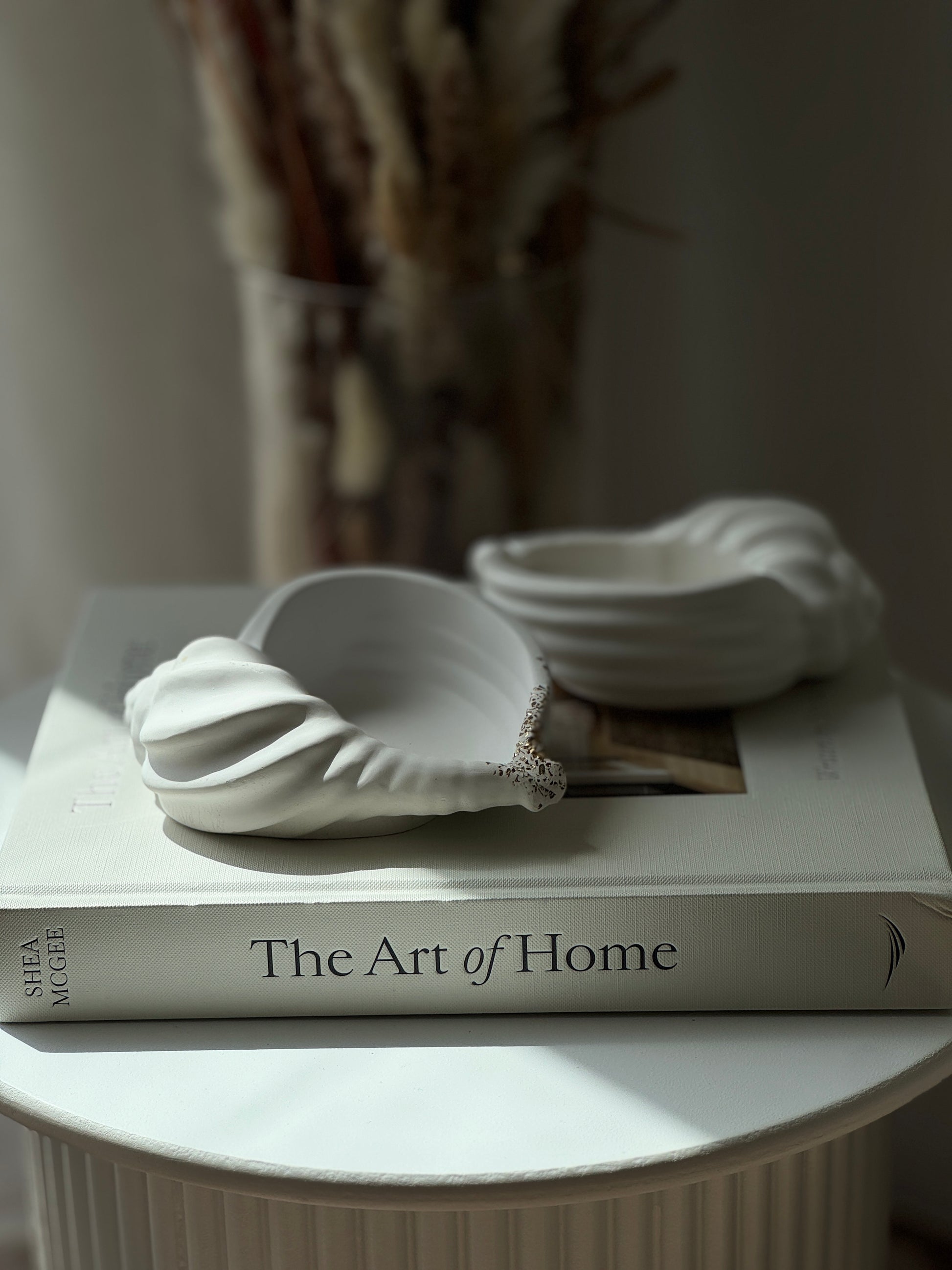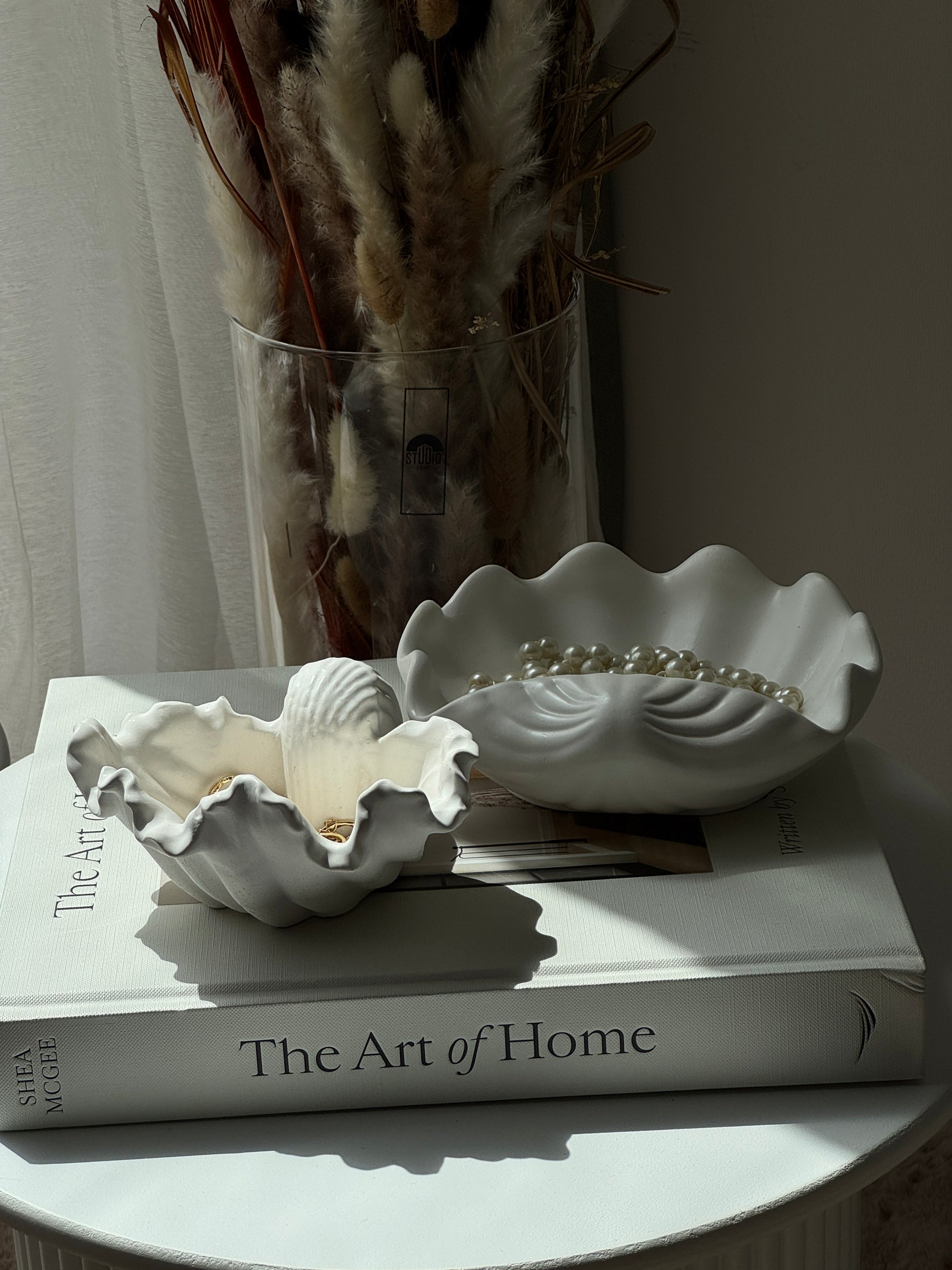 Handmade seashell-inspired trays that bring coastal elegance into your home. Perfect for styling jewelry, candles, or simply as decorative pieces, each form is sculpted in eco-resin with detailed textures that capture the beauty of the sea. Available in classic matte or with gold stone accents.