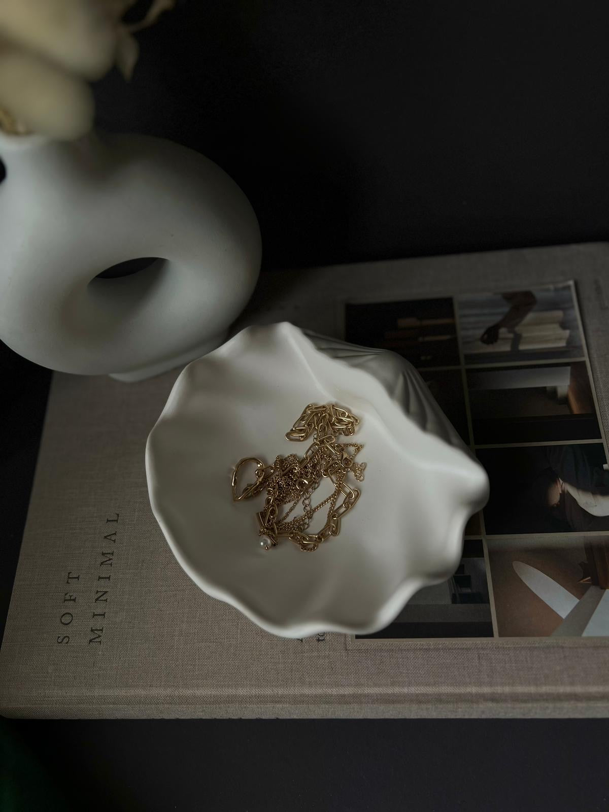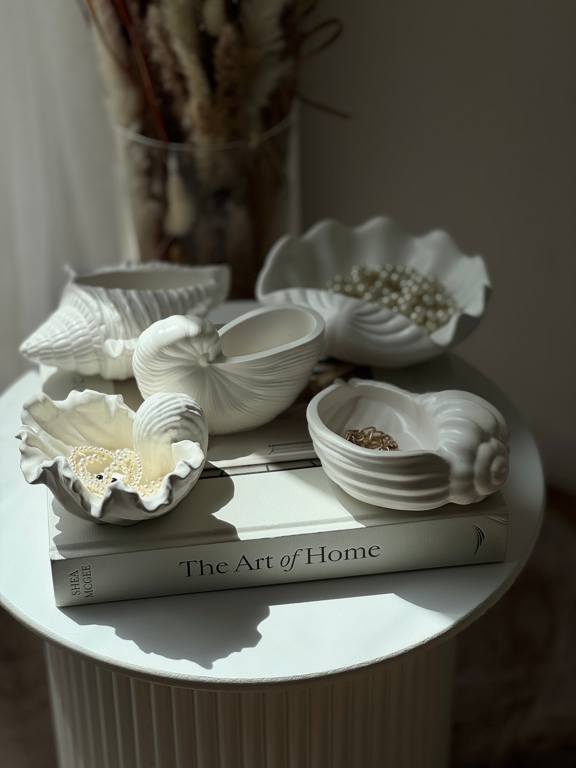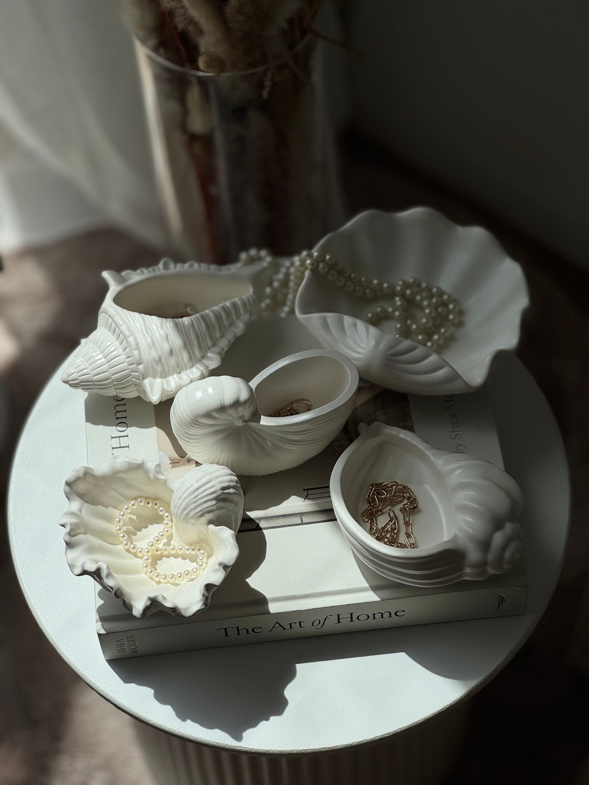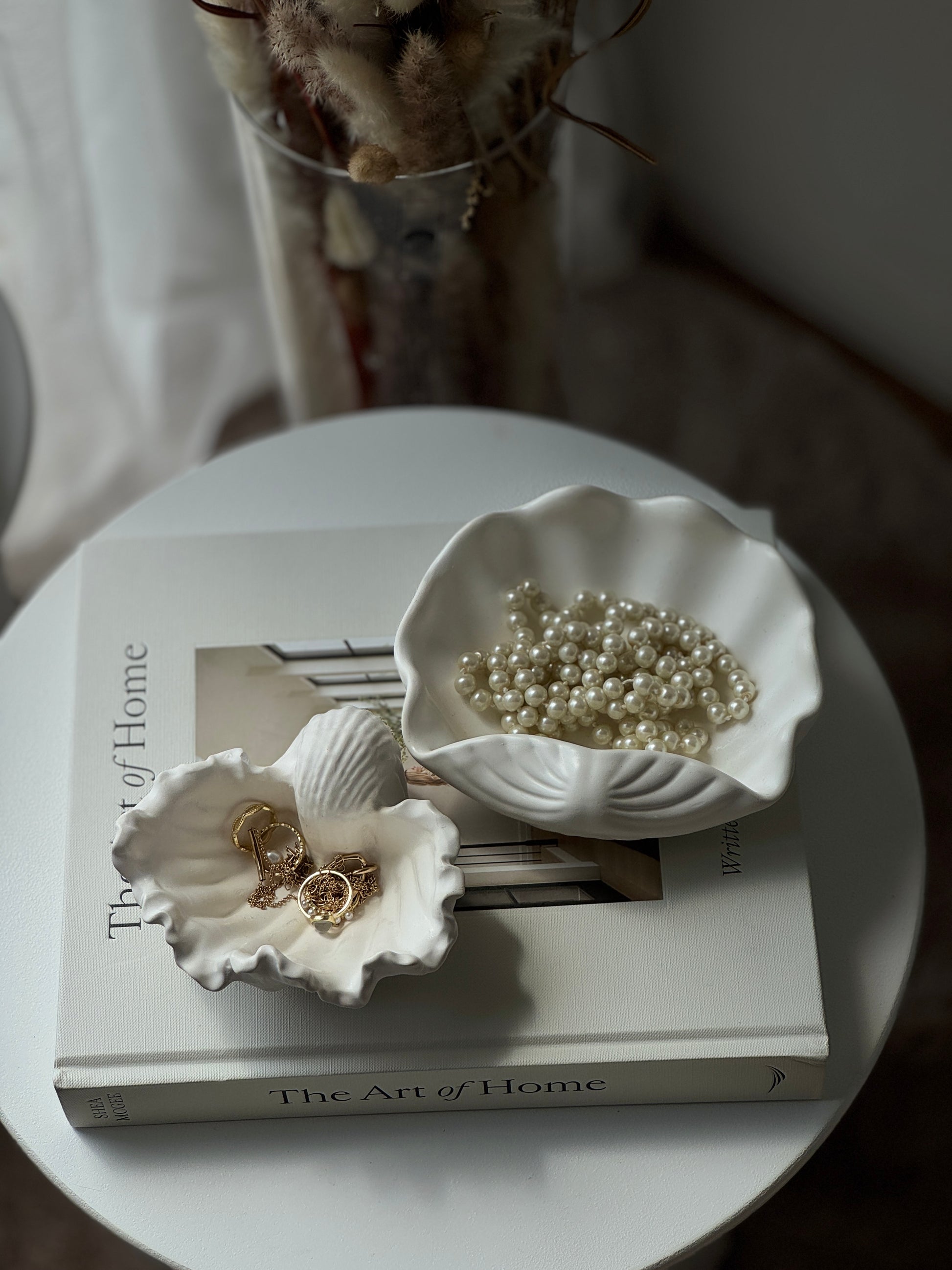 Handmade seashell-inspired trays that bring coastal elegance into your home. Perfect for styling jewelry, candles, or simply as decorative pieces, each form is sculpted in eco-resin with detailed textures that capture the beauty of the sea. Available in classic matte or with gold stone accents.