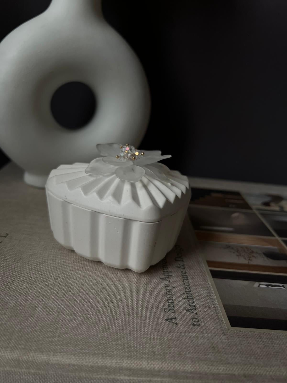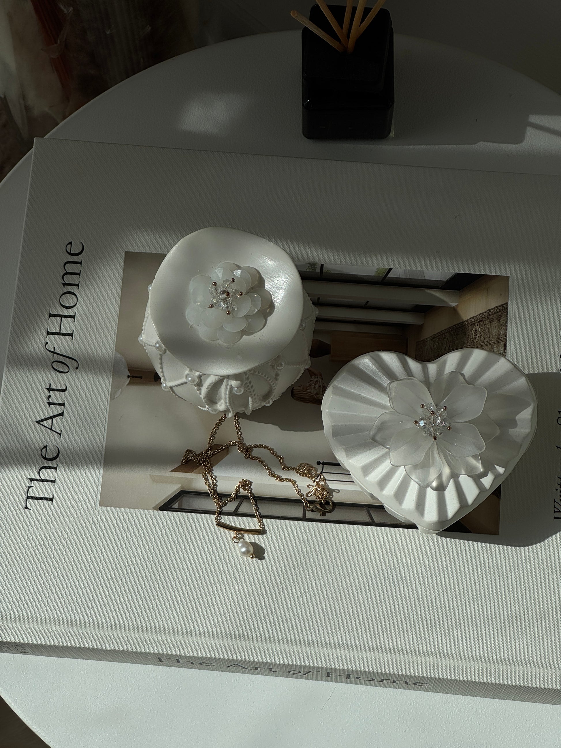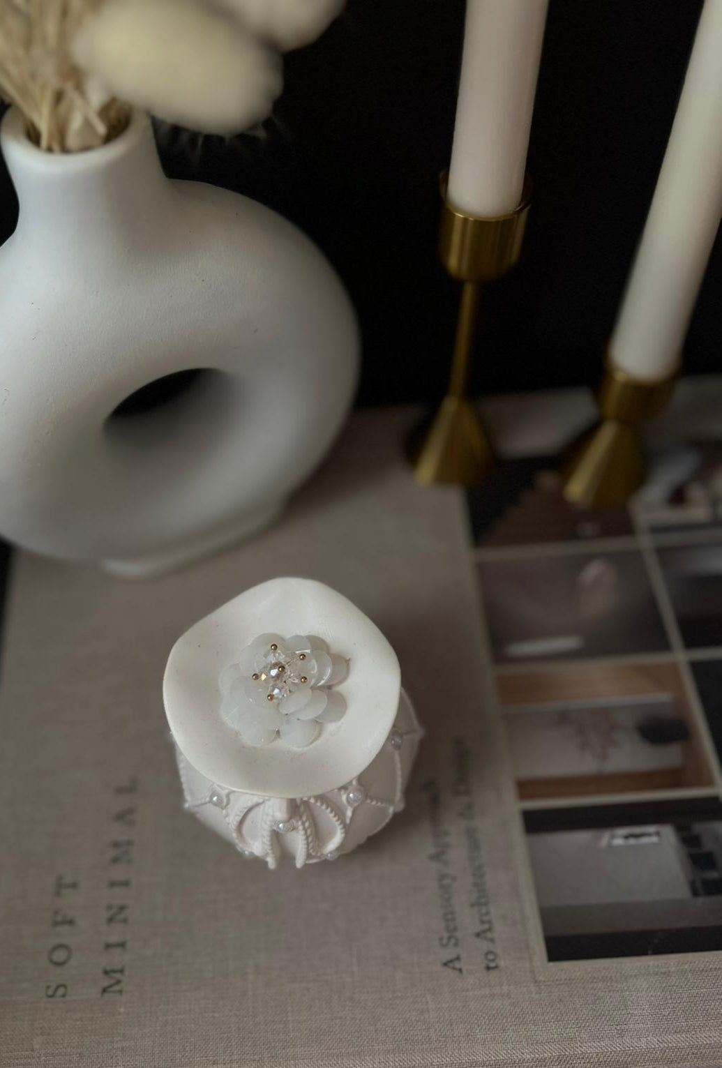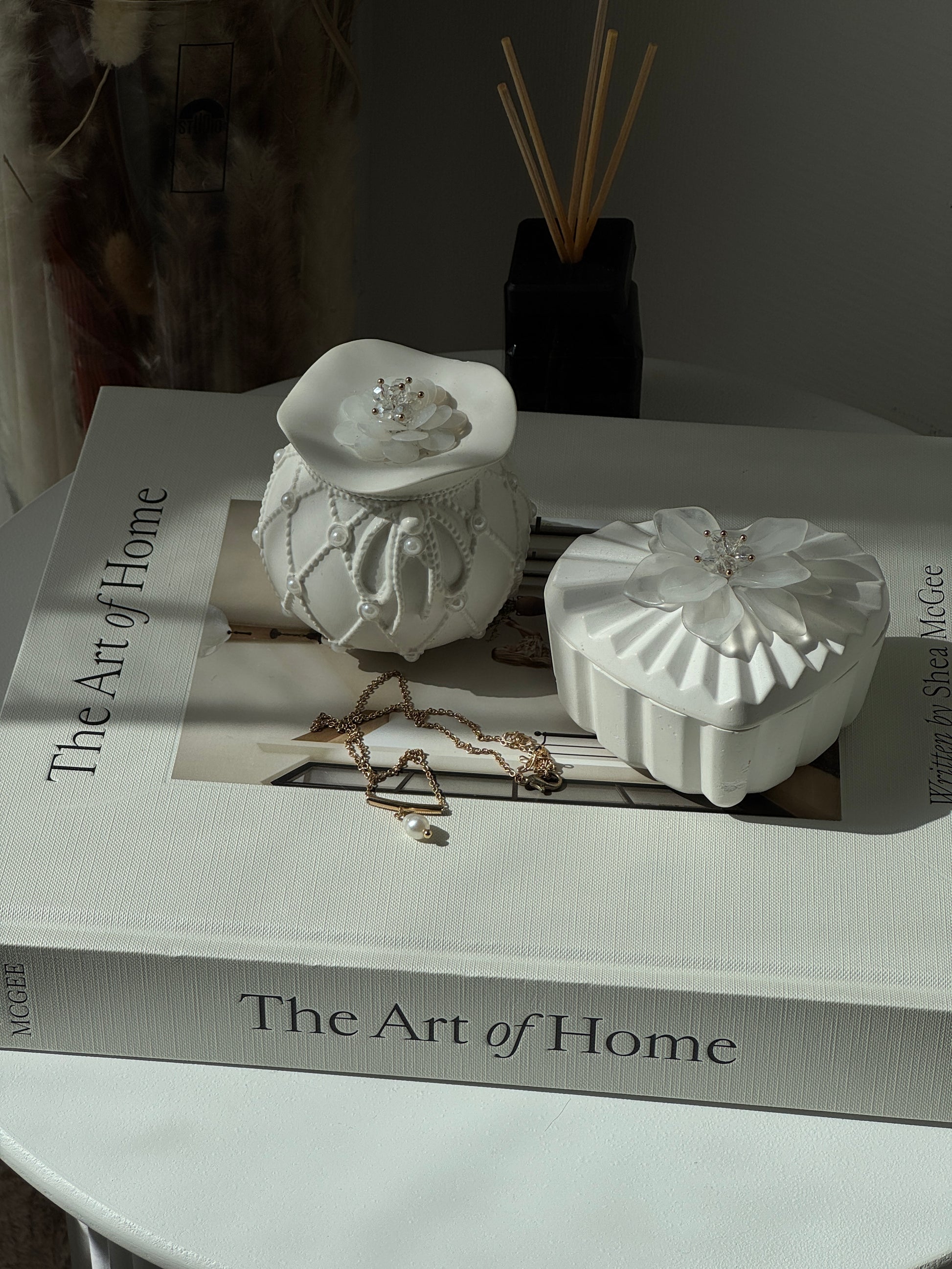 The Pearl Garden Collection is a tribute to timeless femininity and soft detailing. Each jar is handcrafted with a sculptural lid inspired by blossoming petals and adorned with subtle pearl accents — perfect for storing jewelry, keepsakes, or simply elevating your space with charm.