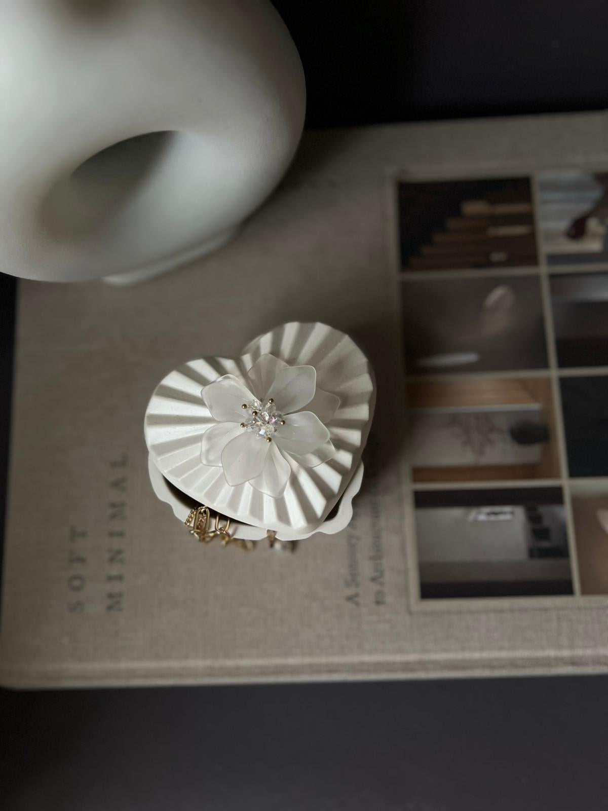 - Petal Lid Jar – Fluted heart-shaped base with sculptural lines and delicate flower detail