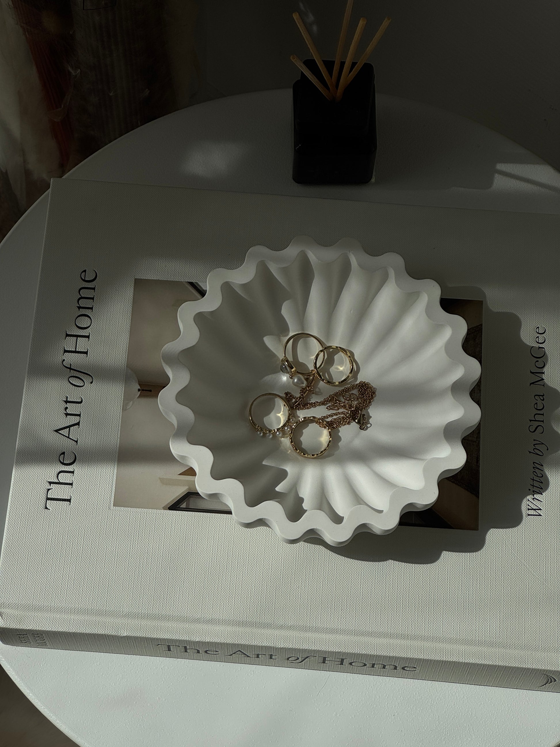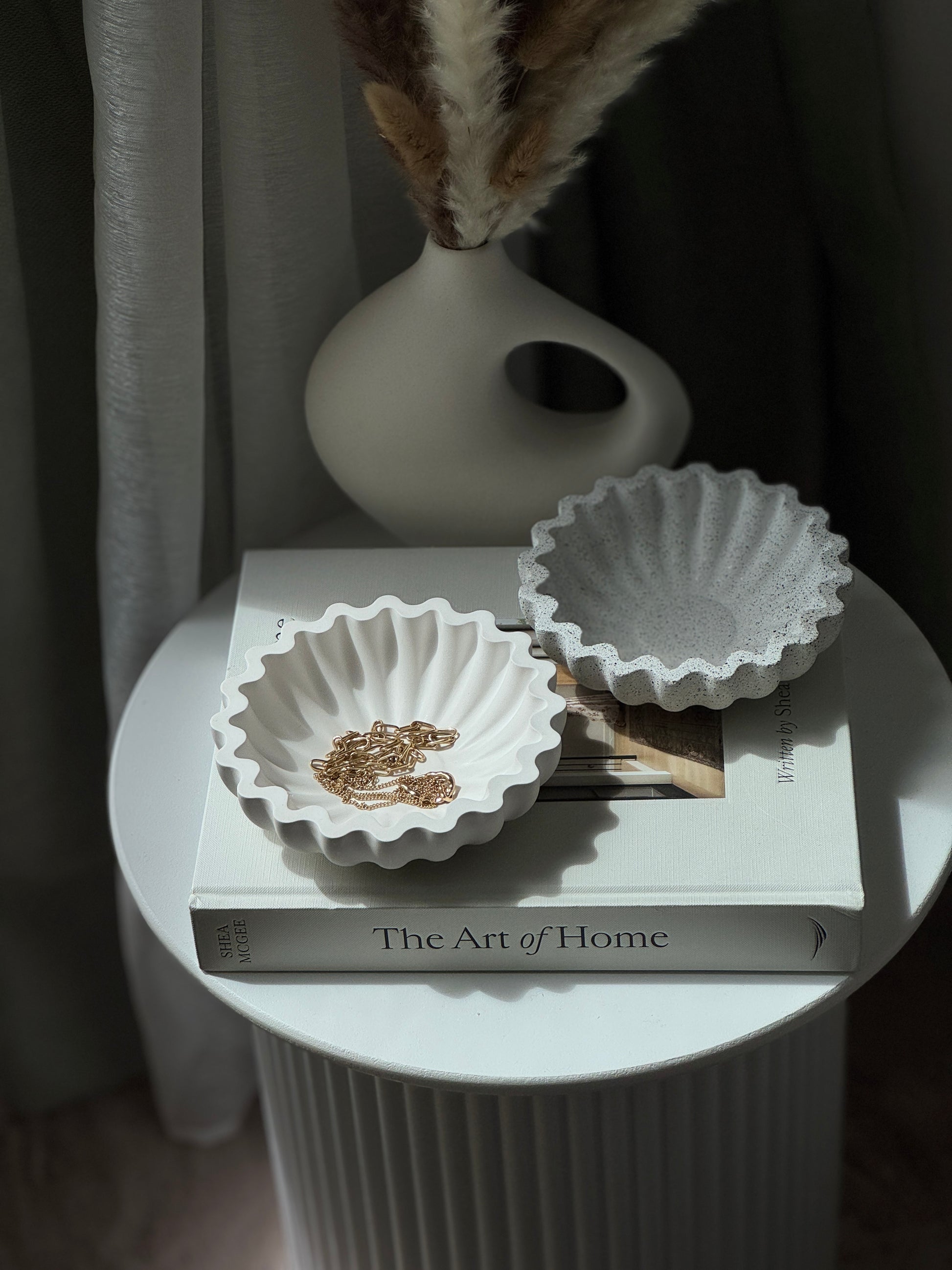 Inspired by the soft movement of fabric and water, our ripple-edge trays are designed to bring a sense of calm and modern refinement to your space. Each piece is hand-poured from Jesmonite, giving it a stone-like feel with a lightweight finish—perfect for displaying jewelry, candles, or decorative accents.